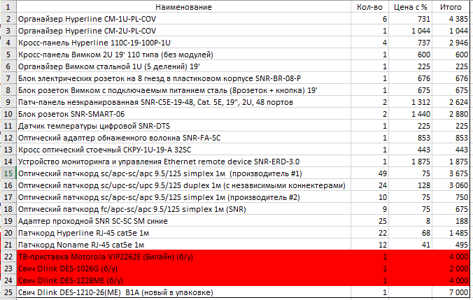 el_misho Posted September 13, 2016 Posted September 13, 2016 (edited) Всем привет, В связи с ликвидацией компании продаем остатки. Все новое - 75% от стоимости, Б/У - 40% от стоимости. (Б/У помечено, остальное все новое, запечатано в оригинальной упаковке). Цену и кол-во см. в приатаченной таблице. Оплата на карту. Отправка любой ТК за ваш счет сразу после оплаты. Кто возьмет все сразу - цена доп.скидкой 44000р. -Органайзер Hyperline CM-1U-PL-COV -Органайзер Hyperline CM-2U-PL-COV -Кросс-панель Hyperline 110С-19-100P-1U -Кросс-панель Вимком 2U 19' 110 типа (без модулей) -Органайзер Вимком стальной 1U (5 делений) 19' -Блок электрических розеток на 8 гнезд в пластиковом корпусе SNR-BR-08-P -Блок розеток Вимком с подключаемым питанием сталь (8розеток + кнопка) 19' -Патч-панель неэкранированная SNR-C5E-19-48, Cat. 5E, 19", 2U, 48 портов -Блок розеток SNR-SMART-06 -Датчик температуры цифровой SNR-DTS -Оптический адаптер обнаженного волокна SNR-FA-SC -Кросс оптический стоечный СКРУ-1U-19-A 32SC -Устройство мониторинга и управления Ethernet remote device SNR-ERD-3.0 -Оптический патчкорд sc/apc-sc/apc 9.5/125 simplex 1м (производитель #1) -Оптический патчкорд sc/upc-sc/upc 9.5/125 duplex 1м (с независимыми коннектерами) -Оптический патчкорд sc/apc-sc/apc 9.5/125 simplex 1м (производитель #2) -Оптический патчкорд fc/apc-sc/apc 9.5/125 simplex 1м (SNR) -Адаптер проходной SNR SC-SC SM синие -Патчкорд Hyperline RJ-45 cat5e 1м -Патчкорд Noname RJ-45 cat5e 1м -ТВ-приставка Motorola VIP2262E (Билайн) (б/у) -Свич Dlink DES-1026G (б/у) -Свич Dlink DES-1228ME (б/у) -Свич Dlink DES-1210-26(ME) B1A (новый в упаковке) Н.Новгород 891010299 семьдесят четыре --Михаил Edited September 14, 2016 by el_misho Вставить ник Quote