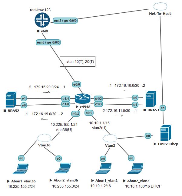 DemonS Posted October 13, 2016 Posted October 13, 2016 (edited) Проблема с переходом на ip unnumbered. Есть схема: Исходная задача: Необходимо, чтобы каждый влан уходил в инет через свой брас. Для решения есть два способа, pbr - прописывать политики для указания next-hop нужного браса для каждого пакета, который предназначен для интернета. Либо использовать vrf, а в этом vrf - умолчательный маршрут на нужный брас. У меня есть стойкое убеждени, что вторая схема будет правильнее и оверхеда процессора будет меньше. Могу ошибаться. Брасы на схеме остановлены - это нормально, непринципиально. Рабочий конфиг циски: ! ip vrf Nas2 rd 65000:2 route-target export 65000:2 route-target import 65000:3 ! ip vrf Nas3 rd 65000:3 route-target export 65000:3 route-target import 65000:2 ! ip cef ! vlan internal allocation policy ascending ! interface Ethernet0/0 switchport trunk encapsulation dot1q switchport trunk allowed vlan 10,20 switchport mode trunk duplex auto ! interface Ethernet0/2 description abons-nas2 switchport access vlan 2 switchport mode access duplex auto ! interface Ethernet0/3 description abons-nas3 switchport access vlan 36 switchport mode access duplex auto ! interface Ethernet1/0 description nas2-uplink no switchport ip vrf forwarding Nas2 ip address 172.16.19.2 255.255.255.252 ! interface Ethernet1/1 description nas2-mx-uplink switchport access vlan 20 switchport mode access duplex auto ! interface Ethernet1/2 description nas3-mx-uplink switchport access vlan 10 switchport mode access duplex auto ! interface Ethernet1/3 description cisco-to-nas3-link no switchport ip vrf forwarding Nas3 ip address 172.16.11.2 255.255.255.252 ! interface Vlan1 no ip address shutdown ! interface Vlan2 description vlan2-l3-interface ip vrf forwarding Nas2 ip address 10.10.1.1 255.255.0.0 ! interface Vlan36 description vlan36-l3-interface ip vrf forwarding Nas3 ip address 10.225.155.1 255.255.255.0 ! router bgp 100 bgp router-id 1.1.1.1 bgp log-neighbor-changes ! address-family ipv4 vrf Nas2 redistribute connected exit-address-family ! address-family ipv4 vrf Nas3 redistribute connected exit-address-family ! ! ! ip route vrf Nas2 0.0.0.0 0.0.0.0 172.16.19.1 ip route vrf Nas3 0.0.0.0 0.0.0.0 172.16.11.1 ! Все хорошо, хосты друг друга пингуют, из разных вилановв том числе, все хорошо. Каждый исходящий пакет уходит на нужный брас. Но хочется бОльшего, хочется заюзать ip unnumbered. Потом проще будет переходить на vlan-per-user и т.п. Сказано-сделано. Меняю svi-влан интерфейссы, как unnambered. Ип вешаю на разные лупбеки, лупбеки в нужные vrf, на интерфейсах - ip unnumbered loopback X poll. Получившийся конфиг: ! ip vrf Nas2 rd 65000:2 route-target export 65000:2 route-target import 65000:3 ! ip vrf Nas3 rd 65000:3 route-target export 65000:3 route-target import 65000:2 ! ip cef ! interface Loopback2 ip vrf forwarding Nas2 ip address 10.10.1.1 255.255.0.0 no ip redirects ! interface Loopback3 ip vrf forwarding Nas3 ip address 10.225.155.1 255.255.255.0 no ip redirects no ip unreachables ! interface Ethernet0/0 switchport trunk encapsulation dot1q switchport trunk allowed vlan 10,20 switchport mode trunk duplex auto ! interface Ethernet0/1 shutdown duplex auto ! interface Ethernet0/2 description abons-nas2 switchport access vlan 2 switchport mode access duplex auto ! interface Ethernet0/3 description abons-nas3 switchport access vlan 36 switchport mode access duplex auto ! interface Ethernet1/0 description nas2-uplink no switchport ip vrf forwarding Nas2 ip address 172.16.19.2 255.255.255.252 ! interface Ethernet1/1 description nas2-mx-uplink switchport access vlan 20 switchport mode access duplex auto ! interface Ethernet1/2 description nas3-mx-uplink switchport access vlan 10 switchport mode access duplex auto ! interface Ethernet1/3 description cisco-to-nas3-link no switchport ip vrf forwarding Nas3 ip address 172.16.11.2 255.255.255.252 ! interface Vlan2 description vlan2-l3-interface ip vrf forwarding Nas2 ip unnumbered Loopback2 poll no ip unreachables ! interface Vlan36 description vlan36-l3-interface ip vrf forwarding Nas3 ip unnumbered Loopback3 poll ip helper-address vrf Nas2 10.10.1.11 no ip redirects no ip unreachables ! router bgp 100 bgp router-id 1.1.1.1 bgp log-neighbor-changes ! address-family ipv4 vrf Nas2 redistribute connected exit-address-family ! address-family ipv4 vrf Nas3 redistribute connected exit-address-family ! no ip http server ip route vrf Nas2 0.0.0.0 0.0.0.0 172.16.19.1 ip route vrf Nas3 0.0.0.0 0.0.0.0 172.16.11.1 ! Маршруты есть в обоих vrf: Router#show ip route vrf Nas2 S* 0.0.0.0/0 [1/0] via 172.16.19.1 10.0.0.0/8 is variably subnetted, 4 subnets, 3 masks C 10.10.0.0/16 is directly connected, Loopback2 L 10.10.1.1/32 is directly connected, Loopback2 B 10.225.155.0/24 is directly connected (Nas3), 00:04:57, Loopback3 L 10.225.155.1/32 is directly connected, Loopback3 172.16.0.0/16 is variably subnetted, 4 subnets, 2 masks B 172.16.11.0/30 is directly connected (Nas3), 00:04:57, Ethernet1/3 L 172.16.11.2/32 is directly connected, Ethernet1/3 C 172.16.19.0/30 is directly connected, Ethernet1/0 L 172.16.19.2/32 is directly connected, Ethernet1/0 Router#show ip route vrf Nas3 S* 0.0.0.0/0 [1/0] via 172.16.11.1 10.0.0.0/8 is variably subnetted, 4 subnets, 3 masks B 10.10.0.0/16 is dir