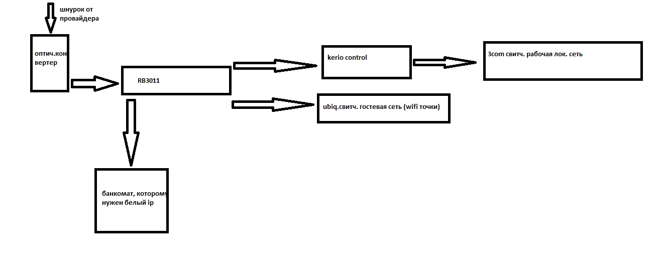 usenkov999 Posted November 9, 2016 Author Posted November 9, 2016 Рисовал в paint'е, простите за это. Так вот, провайдер дал нам 5 белых ip адресов. Мне надо их уместить на микротике, дабы один адрес получил банкомат, один адрес получил керио и один занять самим микротиком дабы сделать его шлюзом в гостевой сети. Вставить ник Quote
