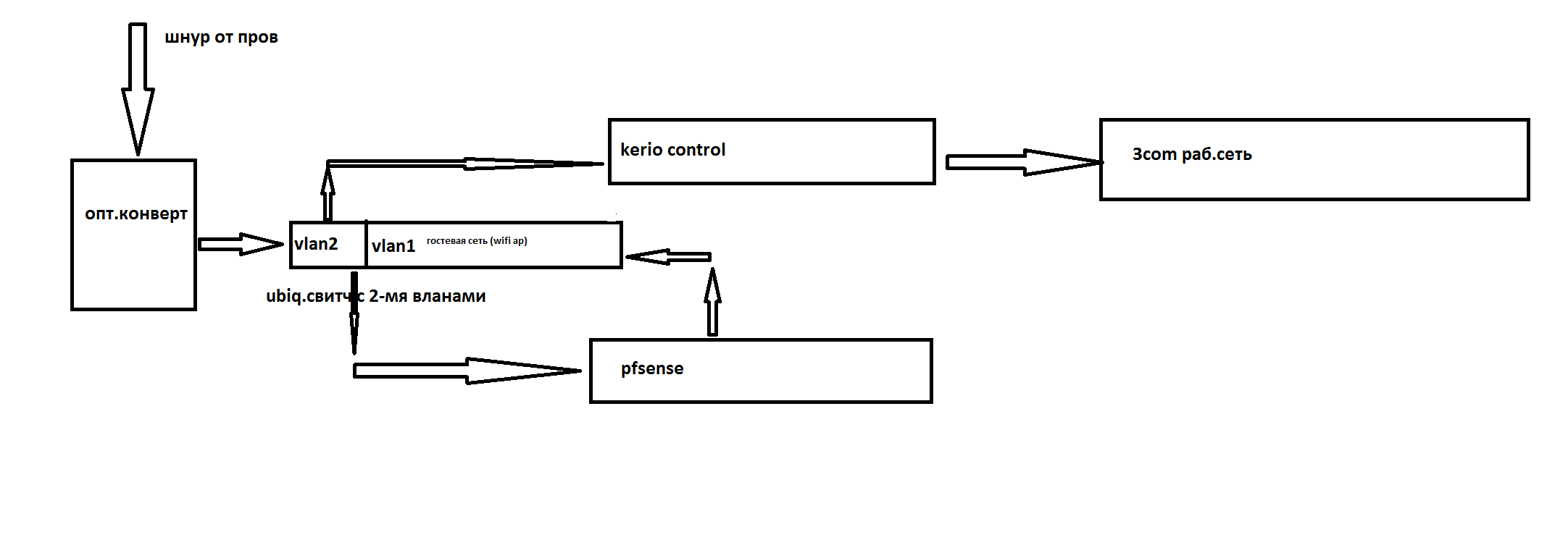 usenkov999 Posted November 9, 2016 Posted November 9, 2016 Здравствуйте! Подскажите пожалуйста с настройкой микротика следующим образом: В организацию приходит оптика, оптика идет на конвертер и оттуда выходит патчкорд. Доступ в интернет по белому ip адресу,без каких либо ppoe или vpn серверов. Белых адресов у нас 5 штук. 1 адрес нужен банкомату, 1 идет на интренет для рабочей сети, 1 идет на инет для гостевой сети,2 в резерве. Сейчас эта схема работает таким образом: из конвертера идет патчкорд на свитч, на свитче 2 влана, на 1-ом влане висит доступ в интернет т.е. патчкорд из конвертера идет в этот влан (простите если коряво объясняю), там выделено 6 портов, в любой из этих 6 портов втыкаюсь,настраиваю себе белый ip и идут в инет. на 2-ом влане соотвественно локальная сеть. Задача сейчас такая: Внедрить микротик перед свитчом, чтобы кабель из конвертера шел сразу на него, на нем так же поднять 2 влана и сделать из этого же микротика шлюз для одной локальной сети. Конечно я могу взять и просто соединить патчкордом на самом микротике 2 влана,дабы поднять нат и выпустить людей в инет, но я думаю что это можно сделать более грамотно и красиво,но пока не пойму как именно. Например смогу ли я просто на микротике занатить 1 влан на другой влан? или нужны еще какие-то дополнительные настройки? Вставить ник Quote