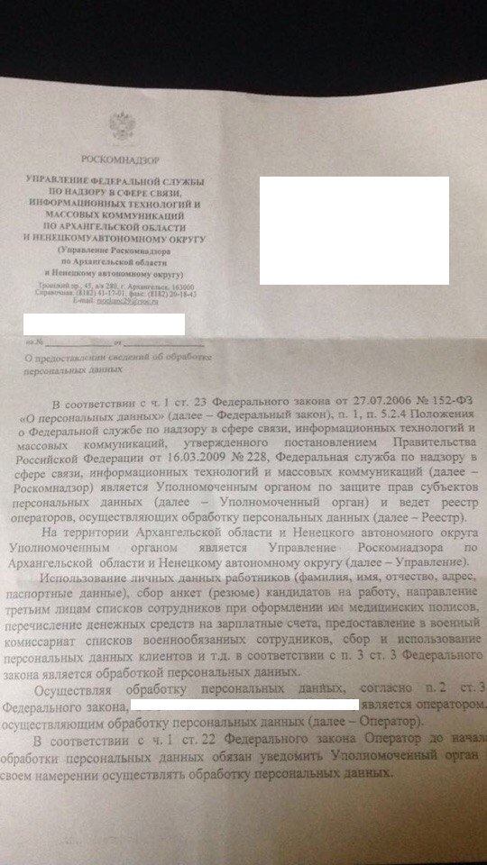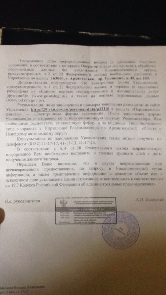 iptester Posted November 24, 2016 Author Posted November 24, 2016 (edited) И.о. руководителя управления Роскомнадзора по Архангельской области и Ненецкому автономному округу А.Н. Колодкину от Генерального директора...... В ответ на Ваше письмо № XXX от XX.XX.XXXX сообщаем, что обработку персональных данных, требующих уведомления уполномоченного органа по защите прав субъектов персональных данных, согласно статье 22 152-ФЗ о персональных данных не осуществляли, не осуществляем и не намерены осуществлять. С уважением, генеральный директор....... Нормально так? Edited November 24, 2016 by iptester Вставить ник Quote