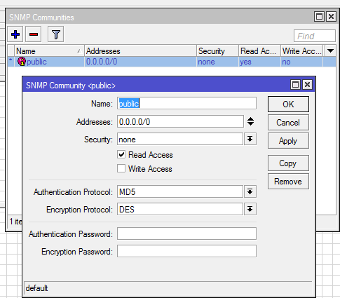 didisila Posted January 13, 2017 Author Posted January 13, 2017 как я понимаю микротик ограничена на write емнип комьюнити "public" as default не имеет прав на запись. комьюнити не проблема , конечно же вклучил write, эти же работают :)) Name sysContact OID .1.3.6.1.2.1.1.4 Name sysName OID .1.3.6.1.2.1.1.5 Name sysLocation OID .1.3.6.1.2.1.1.6 Вставить ник Quote
