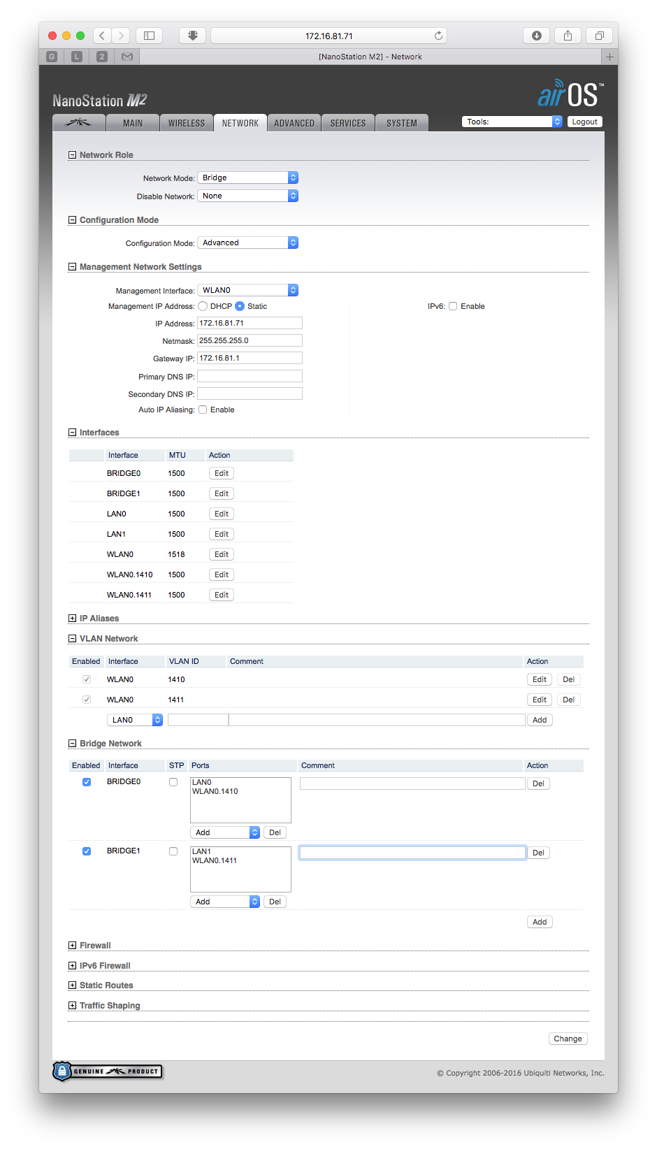 ShumBor Posted February 28, 2017 Posted February 28, 2017 (edited) PowerBeam M5 300 PtP Ходит около 5 вланов, 172 управление. С расширенной настройкой не заморачвивались, просто включили Management VLAN bridge name bridge id STP enabled interfaces br0 ffff.XXXXXXXXXXXX no eth0 ath0 br1 ffff.XXXXXXXXXXXX no eth0.172 ath0.172 Edited February 28, 2017 by ShumBor Вставить ник Quote