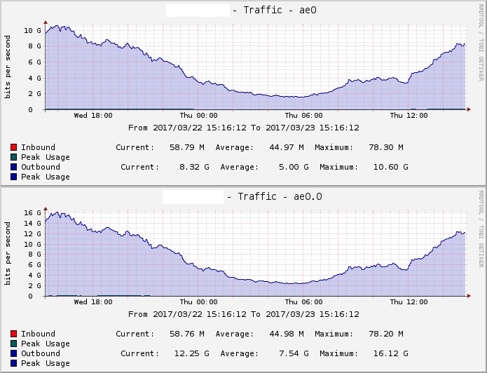 smart85 Posted March 23, 2017 Author Posted March 23, 2017 (edited) Такое впечатление что в счетчиках ae0 не учитываются показания одного из физических интерфейсов агрегированного линка, а в ae0.0 учитываются. Смотрел счетчики на самих xe-ифейсах, при исходящем 9,6Гбит/сек по xe делится 49%/51% Отсюда можно сделать вывод, что реальную картину видно на графике ae0, но мучает вопрос, почему на ae0.0 такая петрушка. Edited March 23, 2017 by mse.rus77 Вставить ник Quote