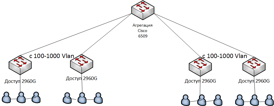 feeman Posted May 16, 2017 Вам связь по Л2 между абонентами этих вланов нужна или нет? Нет Что вы хотите получить в итоге? Хочется вот чего: Установить один шеститонник в роли коммутатора агрегации. И сразу на прямую в него втыкать коммутаторы доступа. По схеме Vlan на здание. Но минус данной схемы в том, что ёмкость Vlan'ов быстро закончиться. И вот вопрос, как правильно поступить? Share this post Link to post Share on other sites More sharing options...