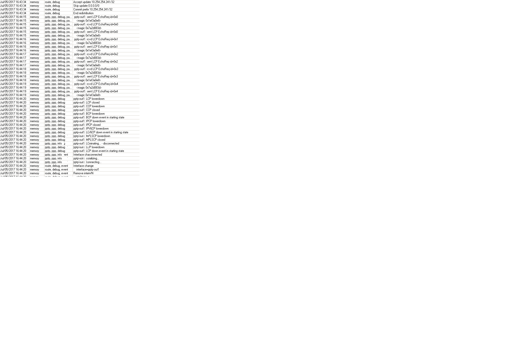 DRiVen Posted July 4, 2017 Как бы выяснить в чем же все таки дело? /system logging add topics=pptp,debug action=memory ? Share this post Link to post Share on other sites More sharing options...
