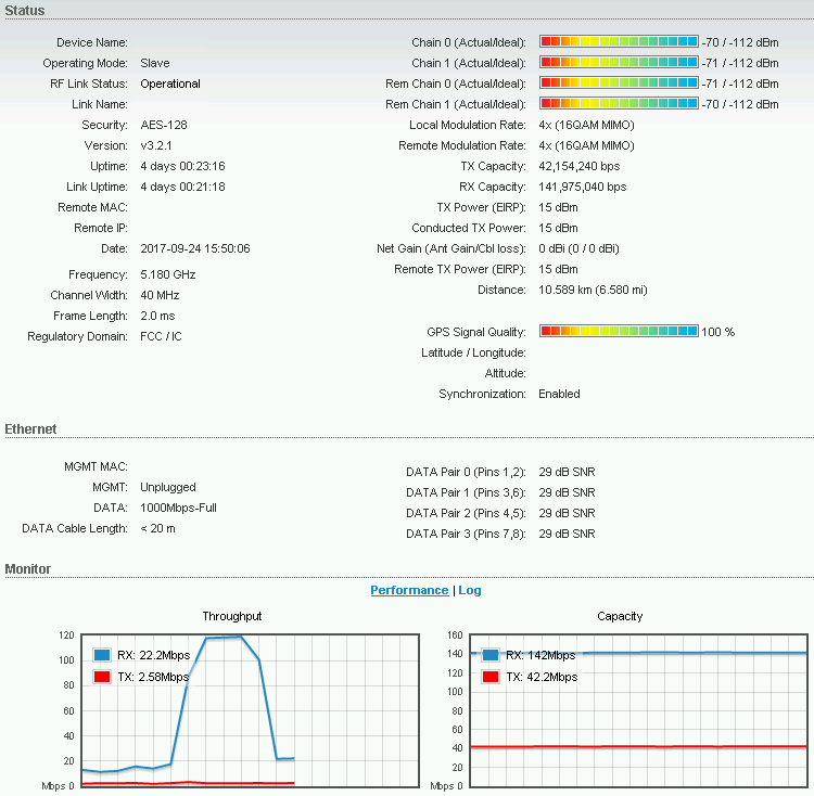 andryas Posted September 24, 2017 23 минуты назад, slv700 сказал: А что -71 дБм на 10 км с 30 дБи дишами это не просадка сигнала? А 16QAM на таком сигнале на 10 км это не просадка модуляции? И что 120М в 40 Мгц для AF5x это не просадка? Спасибо, КЭП, а я и не заметил... Но мы же с Вами о просадке Capacity AF5x, при NLOS под нагрузкой, или я чего-то недопонял? То, что в этих условиях, с сигналом будет всё плохо (на любом оборудовании), это, как бы, и ежу понятно. Мой пример же демонстрирует, что под нагрузкой Capacity довольно плохого линка (а я туда вдул 100 мегабит трафика с размером пакета 320 байт) никак не изменилась при нагрузке. Относительно модуляции, то она (плюс минус лапоть), вполне характерна для полученного уровня сигнала. Share this post Link to post Share on other sites More sharing options...
