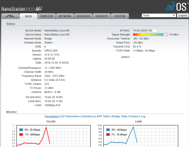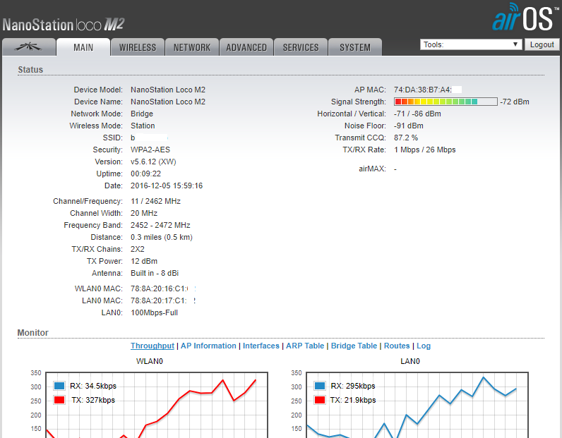Urs_ak Posted October 26, 2017 Author Posted October 26, 2017 На Loco мощность в интерфейсе максимальная стоит, можно только меньше сделать. 48 минут назад, NewUse сказал: на базе одну антенну горезонтально поставьте, через ssh # enable_ct потом в вебе выбрать страну : комплисити тест, убрать шалку eirp Это я не очень разумею - там же OMNI антенны с круговой диаграммой направленности ? База смонтирована обычно - 2 антенны 2,4 торчат вверх и одна антенна торчит вниз. Антенны не нагибаются. 48 минут назад, NewUse сказал: ну и локи в сторону базы поверните Я видел что дальняя точка визуально направленна на базу. Нельзя так прям сказать что она существенно отклонена. Неужели для OMNI-базы надо точно-точно направить? Как лазер какой-то? Может с базой всё-таки что-то не то? Вот эти omni-антенны 4 dbi на базе и 500 метров до клиента, это смущает. Однако судя по картинкам получается что точки базу относительно нормально слышат, а база точки плохо. Странно. Для себя хотел бы понять. Вставить ник Quote