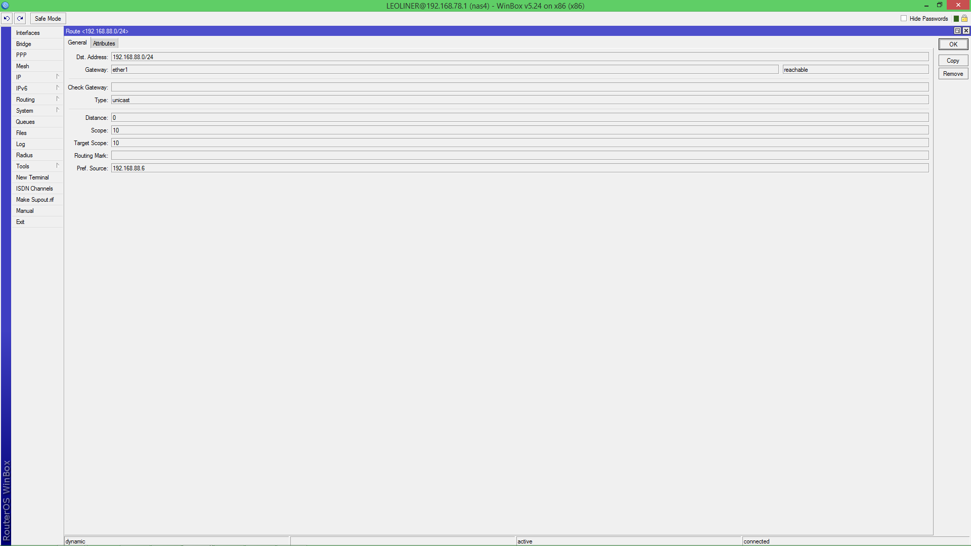 LEOLINER Posted December 8, 2017 Имеется беспроводной мост на базе двух NanoBeam M5, оба устройства настроены в режиме bridge, ip адреса 192.168.88.235, 192.168.88.236. По мосту ходит Инет. Принимает Инет роутер Mikrotik x86, ip адрес внутренний 192.168.78.1, ip адрес внешний 192.168.88.6 на интерфейсе ether1(на нём висит Инет по PPPoE. Ping до устройств идёт, но только от самого микротика. На роутере настроено NAT masquerade, Firewall, есть ещё маркировка и балансировка, но она в данных момент отключена, только маркировка работает. Задача состоит в следующем: нужен доступ на WEB управление NanoBeam M5, из внутренней сети 192.168.78.0/24. Знаю что надо прописать маршрут, но я уже прописывал, всё без толку. Некий динамический маршрут присутствует на микротике. Что интересно ставил обычный роутер Keenetic, прописал маршрут и всё работало, а на тике так не прокатывает. Люди! У кого какие соображения по этому поводу? Динамический маршрут все маршруты: /ip route add disabled=yes distance=1 gateway="(unknown)" routing-mark=to-isp1 add distance=1 gateway=ether2 routing-mark=to-isp2 add check-gateway=ping distance=1 gateway=109.200.00.23 add disabled=yes distance=1 gateway="(unknown),(unknown)" add distance=1 dst-address=192.168.88.0/24 gateway=ether1 Вставить ник Quote Ответить с цитированием Share this post Link to post Share on other sites More sharing options...