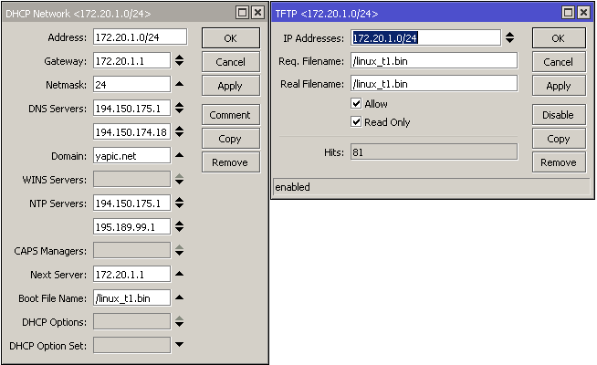 adron2 Posted February 20, 2018 3 часа назад, rdmitrich сказал: Доброго времени суток коллеги, возникла необходимость залить на SXT Lite5, новый образ в виде файла Cn7-vmlinux-init.elf перекопал кучу манов, в частности по Tftpd64, но результата так и не получил, железка получает по DHCP ip адрес, а вот до загрузки дело не доходит. Rcvd DHCP Discover Msg for IP 0.0.0.0, Mac 4C:5E:0C:74:2E:F5 [20/02 21:50:08.321] DHCP: proposed address 10.0.90.11 [20/02 21:50:08.823] Rcvd DHCP Discover Msg for IP 0.0.0.0, Mac 4C:5E:0C:74:2E:F5 [20/02 21:50:08.829] DHCP: proposed address 10.0.90.11 [20/02 21:50:09.331] Rcvd DHCP Discover Msg for IP 0.0.0.0, Mac 4C:5E:0C:74:2E:F5 [20/02 21:50:09.339] DHCP: proposed address 10.0.90.11 [20/02 21:50:09.841] Rcvd DHCP Discover Msg for IP 0.0.0.0, Mac 4C:5E:0C:74:2E:F5 [20/02 21:50:09.844] DHCP: proposed address 10.0.90.11 [20/02 21:50:10.345] Rcvd DHCP Discover Msg for IP 0.0.0.0, Mac 4C:5E:0C:74:2E:F5 [20/02 21:50:10.353] DHCP: proposed address 10.0.90.11 [20/02 21:50:10.856] А там в tftp64 баг в dhcp и именно из за этого микротик с него и не грузится. Используйте другой микротик в качестве dhcp/tftp или linux. Share this post Link to post Share on other sites More sharing options...