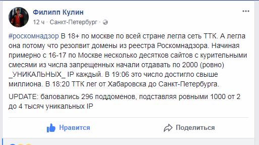 alibek Posted March 16, 2018 Posted March 16, 2018 29 минут назад, lacost сказал: 3. получается, если следовать букве закона, оператор должен перекрыть все эти 4К адресов, и не взирая на протокол и порт перекрыть к ним доступ? Да. Конечно это ошибка, скорее всего начудило какое-то самописное ПО прокуратуры, которое отресолвило кучу IP-адресов и внесло в реестр, и эту ошибку со временем исправят. Но пока нужно блокировать как есть, а не считать себя умнее регулятора. Вставить ник Quote