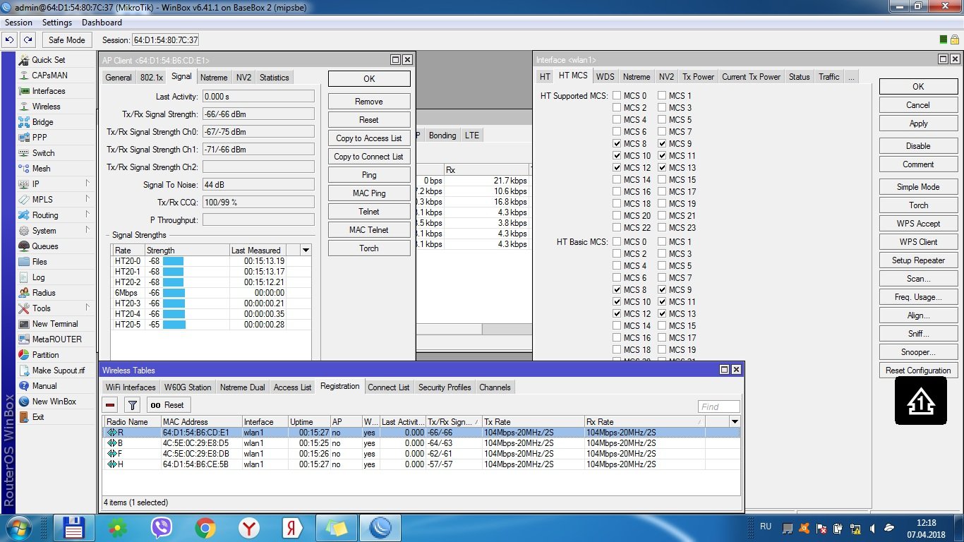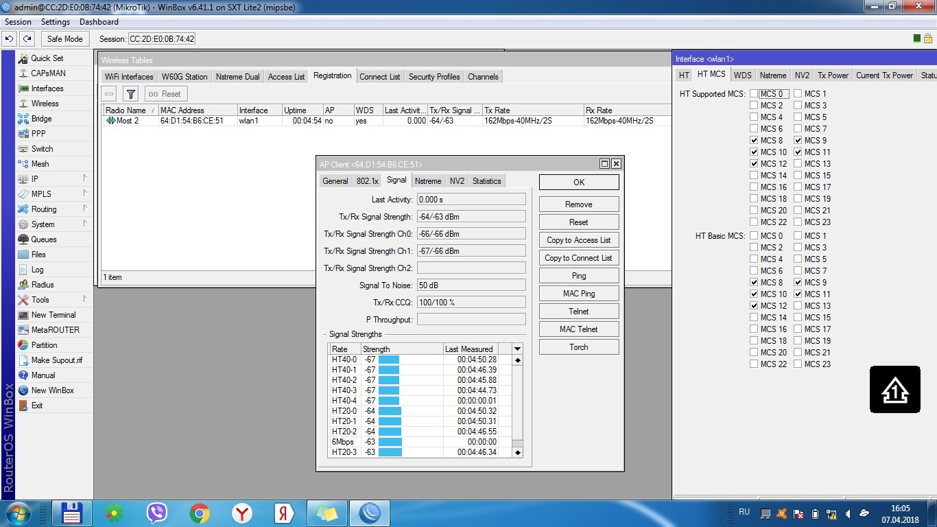 Saab95 Posted April 12, 2018 Posted April 12, 2018 Снимите галки снизу, оставив только одно максимальное значение. Но если сигналы вдруг упадут то клиент уже работать не сможет, ведь сигналы будут ниже возможности передачи на этой канальной скорости. Торч делаете просто - заходите в свойства ether1, жмете кнопку торч, открывается окно, там ставите все галочки и жмете старт. Смотрите какой трафик идет - если это данные к регистратору, то адрес источника будет IP камеры, а адрес назначения - IP регистратора. Никакого другого трафика быть не должно - если он есть, то где-то ошибка в настройки камеры или еще что. Пингуйте адрес камеры с центрального микротика, а так же пингуйте адреса антенн-микротиков. В пинге можно создать новое окно и запустить сразу большое количество пингов, распределив их в окне винбокса, что бы определить где теряется - то есть если пинг до камеры теряется, а до микротика приемного нет, то проблема в кабеле, если и до камеры и до микротика - проблема в радио. Вставить ник Quote