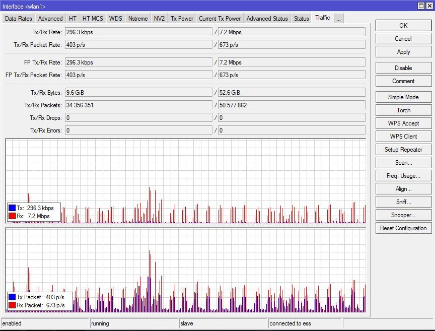relise Posted May 13, 2018 Author Posted May 13, 2018 On 11.05.2018 at 10:07 PM, Saab95 said: Нажимаете кнопочку Advanced mode слева открываются дополнительные вкладки, идете на Data Rates и снимаете оттуда все галочки. Далее идете на HT MCS и ставите там только 8-9. Тестом скорости проверяете что получилось (бандвич тест между микротиками). При этом CCQ должно быть 100. Далее ставите галочку у 10 и так же тестируйте. И так до 15. Найдете такую галочку, после установки которой скорость перестанет увеличиваться и CCQ начнет опускаться. Ее убираете и работаете при тех настройках, когда CCQ идеальное. Если у вас перекос по поляризациям, то ставите галочки 0-7 по той же схеме, это одноканальный режим, когда по каждой поляризации передаются одинаковые данные. Далее останется мощностью поиграть и антенны еще раз покрутить, только не по сигналам смотреть, а запустить тест скорости и ориентироваться на максимальную прокачку, а не силу сигналов. Спасибо за совет. На обоих микротиках это нужно сделать, или достаточно на одном, который как бЫ клиентский? Сделал на том который клиентский на офисе, поснимал все галки HT MCS и далее по инструкции, CCQ не поднялся до 100. On 11.05.2018 at 11:14 PM, npokypop said: Я бы для начала хотел взглянуть что в эфире происходит. Посканил. Перевел обе точки на частоту 2362, стало заметно лучше. По крайней мере speedtest стал показывать реальную скорость на прием 50 Мб, а на передачу 38 МБ (не дотягивает до 50Мб). Spoiler /interface wireless spectral-scan wlan1 buckets=100 range=2.4 FREQ DBM GRAPH 2308 -78 ::::::::::::::::::::::::::::::. 2312 -80 :::::::::::::::::::::::::::. 2317 -79 :::::::::::::::::::::::::::::. 2321 -75 ::::::::::::::::::::::::::::::::::. 2325 -60 :::::::::::::::::::::::::::::::::::::::::::::::::::::::. 2330 -60 :::::::::::::::::::::::::::::::::::::::::::::::::::::::. 2334 -61 :::::::::::::::::::::::::::::::::::::::::::::::::::::. 2339 -59 ::::::::::::::::::::::::::::::::::::::::::::::::::::::::. 2343 -80 :::::::::::::::::::::::::::. 2348 -82 ::::::::::::::::::::::::. 2352 -81 ::::::::::::::::::::::::::. 2356 -89 :::::::::::::::. 2365 -93 :::::::::. 2370 -92 :::::::::::. 2374 -93 :::::::::. 2378 -93 :::::::::. 2383 -72 ::::::::::::::::::::::::::::::::::::::. 2387 -75 ::::::::::::::::::::::::::::::::::. 2391 -74 :::::::::::::::::::::::::::::::::::. 2396 -70 :::::::::::::::::::::::::::::::::::::::::. 2400 -70 :::::::::::::::::::::::::::::::::::::::::. 2405 -71 ::::::::::::::::::::::::::::::::::::::::. 2409 -69 ::::::::::::::::::::::::::::::::::::::::::. 2414 -67 :::::::::::::::::::::::::::::::::::::::::::::. 2418 -67 :::::::::::::::::::::::::::::::::::::::::::::. 2422 -65 ::::::::::::::::::::::::::::::::::::::::::::::::. 2427 -65 ::::::::::::::::::::::::::::::::::::::::::::::::. 2435 -53 :::::::::::::::::::::::::::::::::::::::::::::::::::::::::::::::::. 2444 -61 :::::::::::::::::::::::::::::::::::::::::::::::::::::. 2449 -67 :::::::::::::::::::::::::::::::::::::::::::::. 2453 -66 :::::::::::::::::::::::::::::::::::::::::::::::. 2458 -65 ::::::::::::::::::::::::::::::::::::::::::::::::. 2462 -61 :::::::::::::::::::::::::::::::::::::::::::::::::::::. 2466 -62 ::::::::::::::::::::::::::::::::::::::::::::::::::::. 2471 -66 :::::::::::::::::::::::::::::::::::::::::::::::. 2475 -72 ::::::::::::::::::::::::::::::::::::::. 2480 -75 ::::::::::::::::::::::::::::::::::. 2484 -85 ::::::::::::::::::::. 2488 -81 ::::::::::::::::::::::::::. 2493 -82 ::::::::::::::::::::::::. 2497 -85 ::::::::::::::::::::. 2501 -83 :::::::::::::::::::::::. 2506 -87 :::::::::::::::::. 2510 -89 :::::::::::::::. 2515 -89 :::::::::::::::. 2519 -84 ::::::::::::::::::::::. 2524 -87 :::::::::::::::::. 2528 -89 :::::::::::::::. 2532 -87 :::::::::::::::::. 2537 -87 :::::::::::::::::. 2541 -77 :::::::::::::::::::::::::::::::. 2545 -87 :::::::::::::::::. 2550 -87 :::::::::::::::::. 2554 -87 :::::::::::::::::. 2559 -87 :::::::::::::::::. 2563 -87 :::::::::::::::::. 2568 -86 :::::::::::::::::::. 2572 -84 ::::::::::::::::::::::. 2576 -74 :::::::::::::::::::::::::::::::::::. 2585 -67 :::::::::::::::::::::::::::::::::::::::::::::. 2590 -67 :::::::::::::::::::::::::::::::::::::::::::::. 2594 -67 :::::::::::::::::::::::::::::::::::::::::::::. 2598 -64 :::::::::::::::::::::::::::::::::::::::::::::::::. 2603 -62 ::::::::::::::::::::::::::::::::::::::::::::::::::::. 2607 -63 :::::::::::::::::::::::::::::::::::::::::::::::::::. 2611 -57 :::::::::::::::::::::::::::::::::::::::::::::::::::::::::::. 2616 -54 :::::::::::::::::::::::::::::::::::::::::::::::::::::::::::::::. 2620 -28 ::::::::::::::::::::::::::::::::::::::::::::::::::::::::::::::::::::::::::::::::::. 2625 -28 ::::::::::::::::::::::::::::::::::::::::::::::::::::::::::::::::::::::::::::::::::. 2629 -25 ::::::::::::::::::::::::::::::::::::::::::::::::::::::::::::::::::::::::::::::::::. 2634 -27 ::::::::::::::::::::::::::::::::::::::::::::::::::::::::::::::::::::::::::::::::::. 2638 -27 ::::::::::::::::::::::::::::::::::::::::::::::::::::::::::::::::::::::::::::