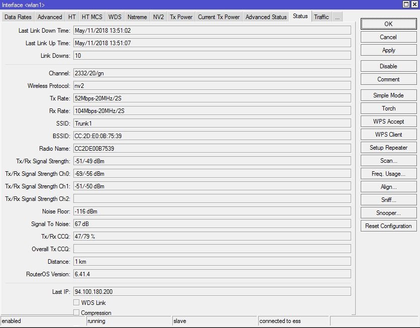 relise Posted May 14, 2018 Author Posted May 14, 2018 4 minutes ago, npokypop said: Тут еще есть несколько моментов:! 1. SXT имею довольно широкую ДН для линков PtP 2. Если эфир загажен, а он скорее всего загажен, то нужно на точке которая является БС, убирать поддержку (support) модуляций с высокой symbol rate, и таким образом повысить CCQ до 100%. Вы имеете ввиду поиграться с галками во вкладке HT MCS? Я так понимаю, что здесь нужно идти по пути который предложил Saab95, но выставлять это на БС? Вставить ник Quote