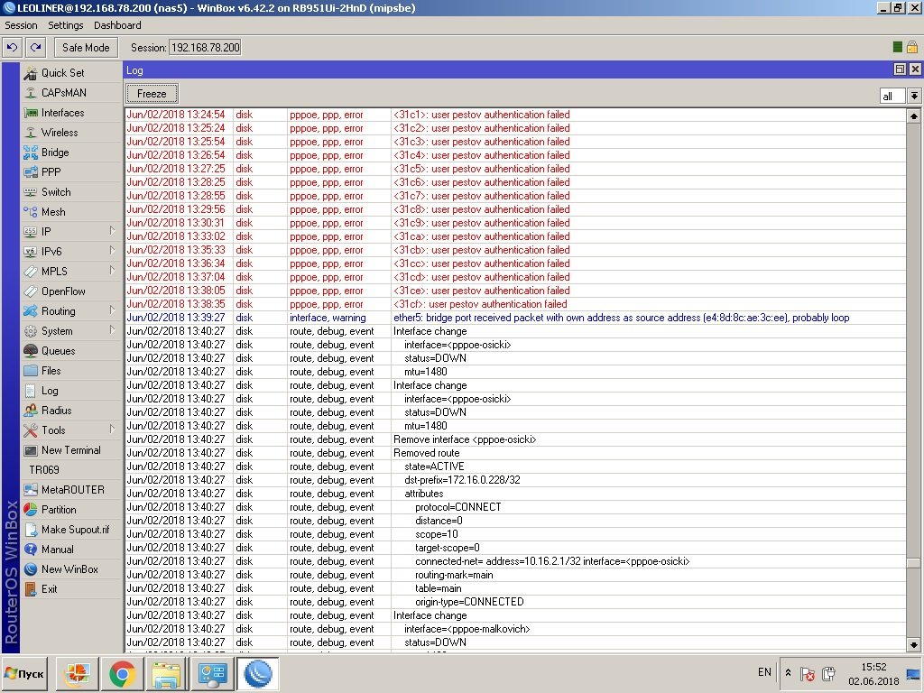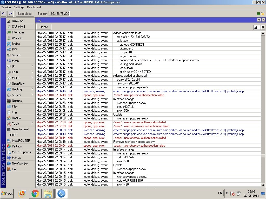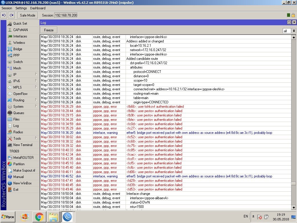 LEOLINER Posted June 2, 2018 Posted June 2, 2018 Форумчане. Доброго времени суток вам. Дней десять назад началась интересная трабла. У меня в сети есть одно место(чердак), где установлен mikrotik rb2011uias-rm, который подключается к интернету и раздаёт оного. На раздаче задействовано всего три ehernet порта. Работал он прекрасно, это был мой лучший канал интернета. Как вдруг он стал самым худшим – в в логах периодически стало появляться сообщение - bridge port received packet with own address as source address probably loop. Появлялось оно нечасто, а раз в несколько часов, могло и час пройти, а могло и девять, но тем не менее проблема возвращалась, интерфейсы падали иногда на время до двух минут, конечно вызывая во мне ярость. Не долго думая решил заменить mikrotik rb2011uias-rm, на новый mikrotik rb951ui-2hnd. На нём стояла новая прошивка v 6.42.2, сразу же расскажу, что при настройке произошли некоторые проблемы. В частности, после удаления начальной конфигурации и настойки с нуля, я не обнаружил привычного мастер порта и пришлось объединить все интерфейсы в бридж. Настроил с горем пополам, вроде бы заработало и тут упс, проявилась, старая трабла вновь и с той же непредсказуемой периодичностью. Краткая конфигурация интерфейсов: 1 порт WAN, к нему подключается интернет, он не включён в бридж; 2 порт включён в бридж, но на нём нет клиентов; 3 порт включён в бридж, на нём сидит один клиент, у него роутор; 4 порт включён в бридж, к нему подключена точка доступа Ubiquiti NanoStation Loco M2, к которой подключено три клиента; 5 порт включён в бридж, к нему подключена точка доступа Ubiquiti PowerBeam M2-400, которая раздаёт мостом интернет далее на 20 клиентов. Как мы видим на скриншоте, часто указывается проблемный интерфейс с маком e4:8d:8c:ae:3c:f1, это пятый порт рутированный, затем чаще стало появляться сообщение о проблеме интерфейса с маком e4:8d:8c:ae:3c:ee, это второй неиспользуемый интерфейс (я кстати откл. его, но это не помогло). Уважаемые, как думаете в чём может быть проблема? Не может дело быть в новой прошивке? Может быть её даунгрейдить на старую версию, где ещё были мастер порты? У всех пользователей оборудование настроено в режиме роутор, кроме одного пользователя, у него да стоит мыльница на пять портов, но он сидит на 4 порту, где вроде проблем не наблюдалось. Жду ваших предположений. Загруженные изображения loop2.jpg 358 kb · Готово Вставить ник Quote