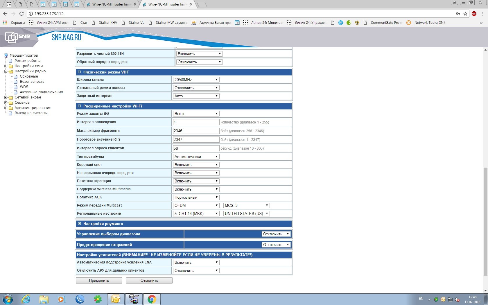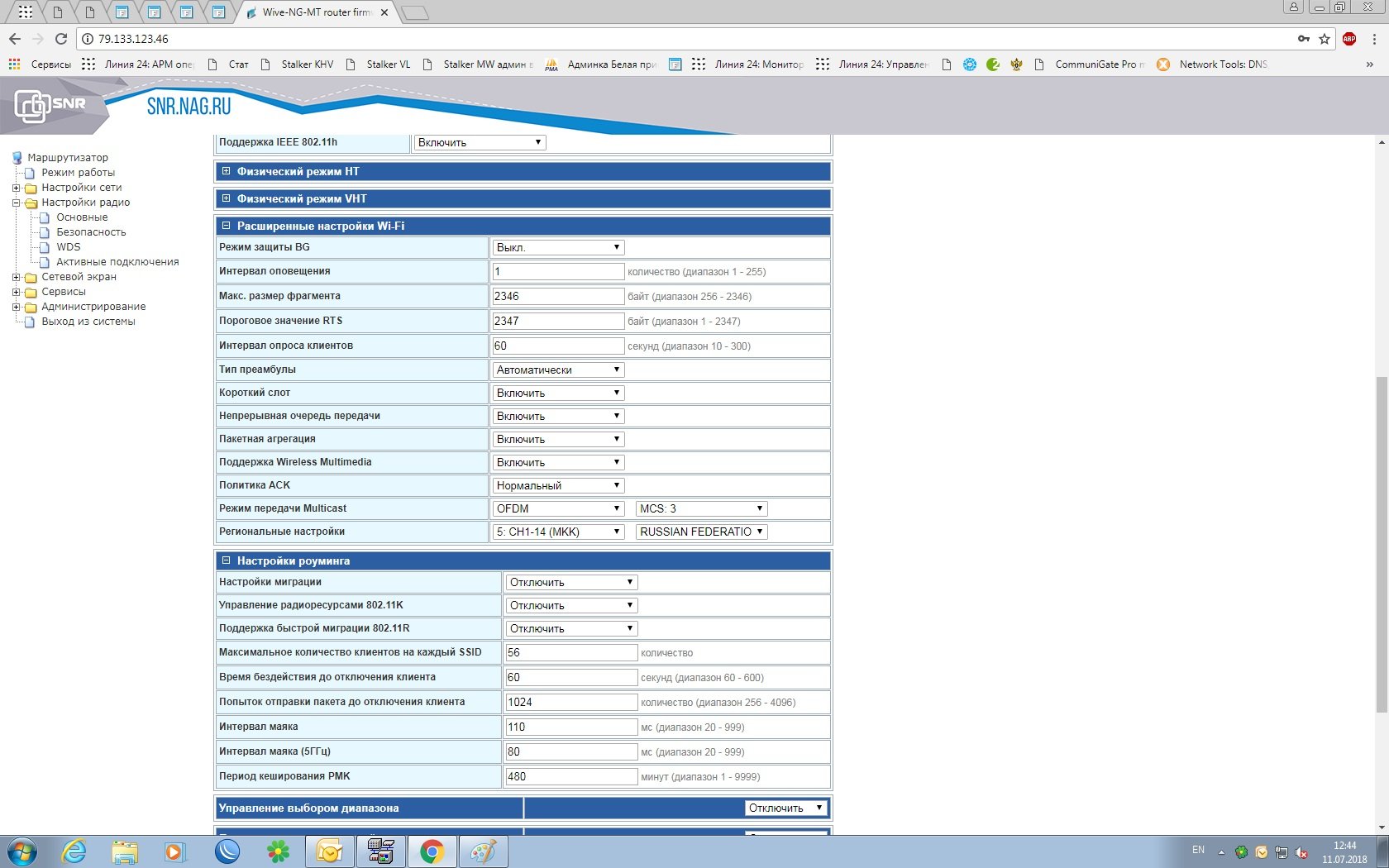 sfstudio Posted July 11, 2018 HT_MCS должен быть = 33 это и есть AUTO. И по умочанию именно так оно и выставлено. Менять его не следует. Регрессия внесена при перезде на nginx и пропущена тестерами. На стороне заказчика. Потому попала в релизы и даже возможно в фабричные сборки. Это крайне неприятная, но всё же не смертельная проблема. Сейчас срочно рефакториться весь блок wireless. Регионы трогать не следует от слова совсем и никогда. RU регион на стороне маршрутизатора полностью выверен и корректно задан. За описание остальных регионов не ручаюсь. P.S.Репортить лучше сразу к нам на форум https://wi-cat.ru PP.S. Переход со старой версией с goahead на nginx и назад крайне желательно выполнять со сбросом настроек в дефолт кнопкой и настройкой вручную. Share this post Link to post Share on other sites More sharing options...