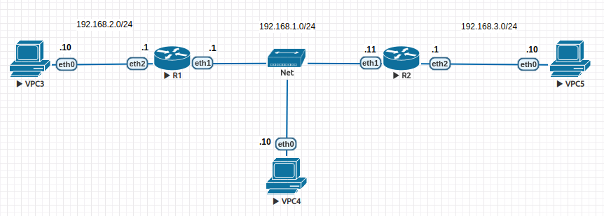 crank Posted August 28, 2018 Собрал указанную выше схему. Всё прекрасно работает. Проверяйте свои настройки, снимайте дампы. Также поищите проблемы на конечных хостах. R1 [admin@R1] > export compact # aug/28/2018 12:23:25 by RouterOS 6.42.1 # software id = # # # /interface ethernet set [ find default-name=ether4 ] name=ether1 set [ find default-name=ether1 ] name=ether2 set [ find default-name=ether2 ] name=ether3 set [ find default-name=ether3 ] name=ether4 /interface wireless security-profiles set [ find default=yes ] supplicant-identity=MikroTik /ip address add address=192.168.1.1/24 interface=ether1 network=192.168.1.0 add address=192.168.2.1/24 interface=ether2 network=192.168.2.0 /ip route add distance=1 dst-address=192.168.3.0/24 gateway=192.168.1.11 /system identity set name=R1 R2 [admin@R2] > export compact # aug/28/2018 12:23:22 by RouterOS 6.42.1 # software id = # # # /interface wireless security-profiles set [ find default=yes ] supplicant-identity=MikroTik /ip address add address=192.168.1.11/24 interface=ether1 network=192.168.1.0 add address=192.168.3.1/24 interface=ether2 network=192.168.3.0 /ip route add distance=1 dst-address=192.168.2.0/24 gateway=192.168.1.1 /system identity set name=R2 Share this post Link to post Share on other sites More sharing options...