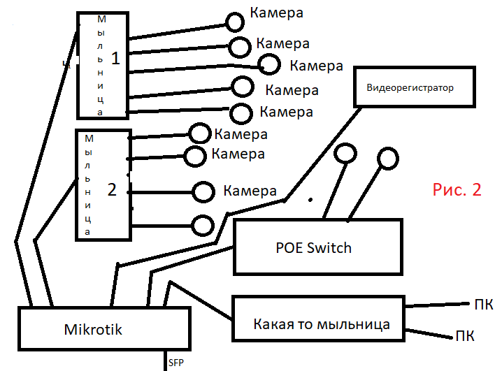 wedwillsont Posted August 31, 2018 Posted August 31, 2018 Доброго времени суток, есть вот такая схема подключения камер (Рис. 1). Изначально стояло все и работало супер пупер, но абонент захотел еще камер и пришлось подключать POE Switch и 3 камеры к нему, соответственно и регистратор заменили на больше каналов, но тут встала проблема если подключать регистратор как на (Рис. 1) то в регистраторе отображаются камеры только с первой мыльницы, а если подключать так как на Рис. 2 то трансляция идет только с второй мыльницы. На данном микротике на всех портах куда подключено оборудование для видеонаблюдения стоит 15 Vlan единственный порт на котором vlan 255 это тот куда подключена мыльница с ПК. Так вот, кто может объяснить причину данной аномалии? Возвращать старый регистратор нет возможности т.к. клиент довольно трудный и ооочень много задает вопросов. Вставить ник Quote