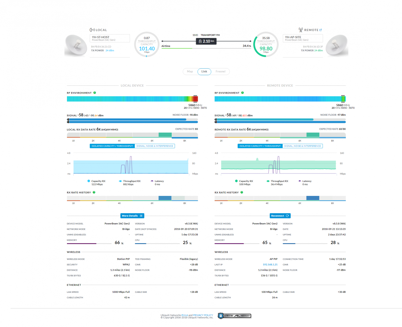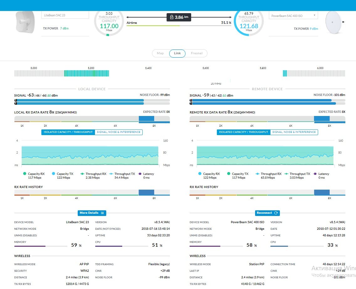 alibek Posted November 6, 2018 Верхняя (локальная) антенна установлена на крыше здания, полметра от крыши, метров 10 от земли. Нижняя (удаленная) антенна установлена на боковой стене 5-этажки, метров 12-14 от земли. Реагирует не мгновенно, но достаточно быстро, а антенны мы подкручивали медленно. Раньше там была NanoStation5, но при трафике в 35М начиналась деградация. Share this post Link to post Share on other sites More sharing options...