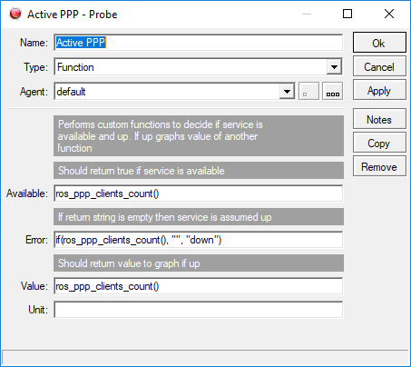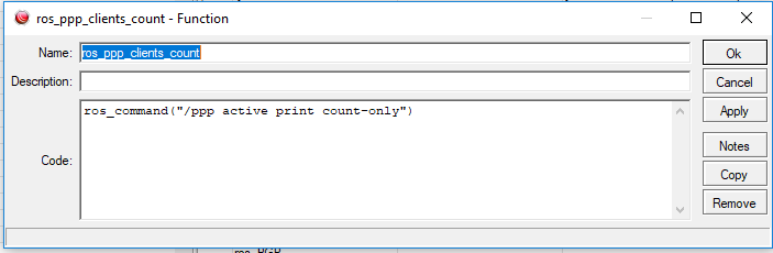 saaremaa Posted November 1, 2018 Posted November 1, 2018 У нас CCR сам отправляет эту статистику(количество PPPoE- сессий) на сервер, а дальше уж как надо делайте оповещения: /system scheduler add interval=1m name=pppoe_count_send on-event=":local pppcount [/ppp active print count-only]\r\ \n\r\ \n/tool fetch url=\"http://[IP_address_server]/zr/pppoe-count.php\\\?ip=[IP_address_PPPoE_SERVER]&pppcount=\$pppcount\" keep-result=no mode=http\r\ \n\r\ \n" policy=ftp,reboot,read,write,policy,test,password,sniff,sensitive,romon start-time=startup ,где: [IP_address_server] - адрес сервера куда отрпавляете [IP_address_PPPoE_server] - адрес PPPoE сервера pppoe-count.php - наипростейший скрипт по разбору GET-запроса и складывания в базу. Вставить ник Quote