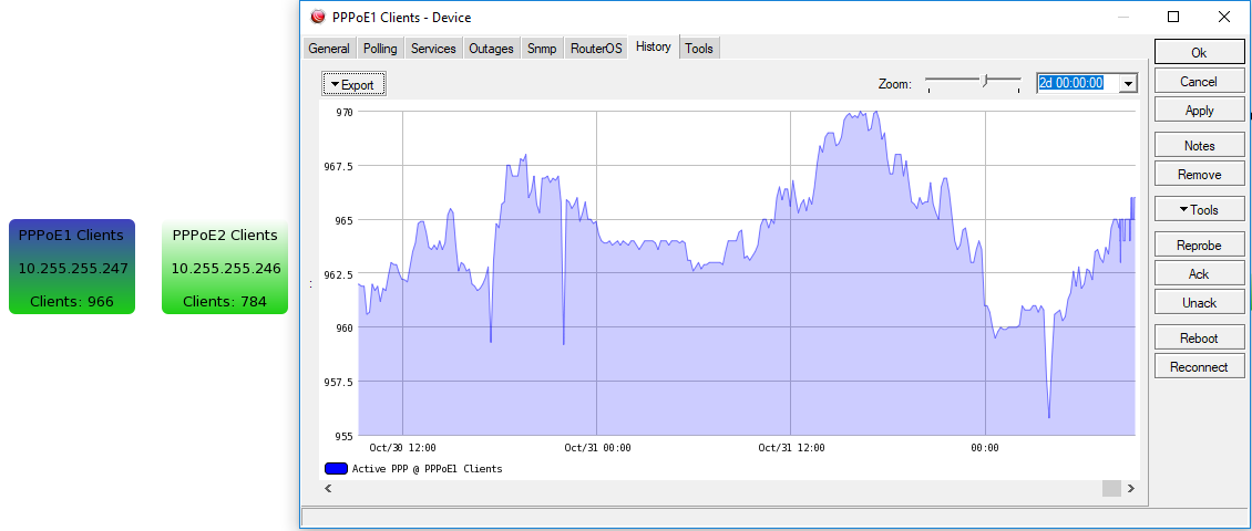 maxkst Posted November 1, 2018 Posted November 1, 2018 У меня работает на дудке. Показывает текущее количество сессий, и рисует график. Очень полезно и информативно. Ночные отключения роутеров в пределах погрешности, не мешают. Показывает сбои в сети, даже те, о которых никто не подозревает, и не беспокоит соответственно. В частности, у нас полностью радио сеть на оспф, реально полезная статистика. Видно три дропа за последние пару дней, по логам можно найти, где и дальше разбираться, почему Видно три дропа за последние пару дней, по логам можно найти, где и дальше разбираться, почему @swat11 дайте знать если нужна помощь, ну и хотелось бы узнать, помог или нет )) Вставить ник Quote