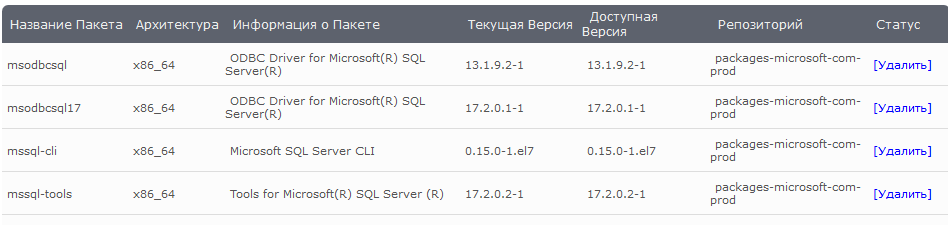 danila77 Posted November 11, 2018 Author Posted November 11, 2018 У меня заработал следующий способ. 1. подключаем репозиторий майкрософт (msprod.repo) 2. устанавливаем пакеты как на скриншоте. (может нужны и не все, но я поставил так) 3. в /etc/odbcinst.ini: [ODBC_Driver_17_for_SQL_Server] Description=Microsoft ODBC Driver 17 for SQL Server Driver=/opt/microsoft/msodbcsql17/lib64/libmsodbcsql-17.2.so.0.1 UsageCount=1 В названии драйвера поменял пробелы на подчёркивания, с пробелами почему-то не работало. 4. В odbc.ini: [MS_SQL] Driver=ODBC_Driver_17_for_SQL_Server Server=адрес сервера Port=1433 Database=имя базы UID=пользователь для запроса PWD=пароль Тут в реквизиты для подключения. 5. проверяем настройки: osql -S MS_SQL -U пользователь -P пароль Если видим такое: Configuration looks OK. Connection details: DSN: MS_SQL odbc.ini: /etc/odbc.ini Driver: /opt/microsoft/msodbcsql17/lib64/libmsodbcsql-17.2.so.0.1 Server hostname: у меня тут IP сервера Address: у меня тут IP сервера Attempting connection as sa2 ... + isql MS_SQL пользователь пароль -v +---------------------------------------+ | Connected! | | | | sql-statement | | help [tablename] | | quit | | | +---------------------------------------+ SQL> То значит подключение проходит, и можно делать запрос. Если выходят ошибки, то смотрим что не так и исправляем. У меня просто выкидывало пробелы в названии драйвера, после выше приведённого исправления заработало. msprod.repo Вставить ник Quote
