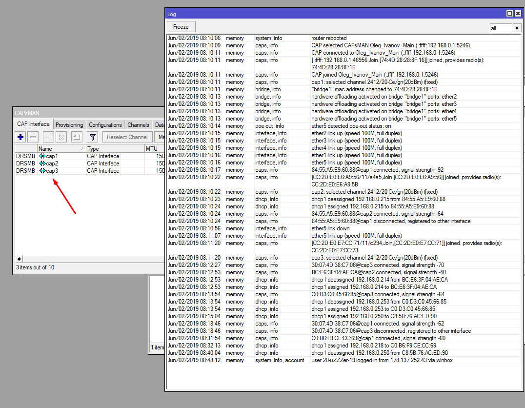calutiya Posted June 2, 2019 @nkusnetsov Спасибо!!! 1) да, Вы правы, у меня не прописано подключение к CAPsMANу по IP-адресу, а выполняется автодискавери в бридже 3) это в смысле на хосте в бридже? Да, конечно, IP-адрес 192.168.0.1 назначен именно бриджу, а не eth1 А вот лог работы за последние 40 минут, и как говорится: не единого обрыва!!! и капсы туда-сюда не прыгают, хотя я ничего не делал :( Share this post Link to post Share on other sites More sharing options...