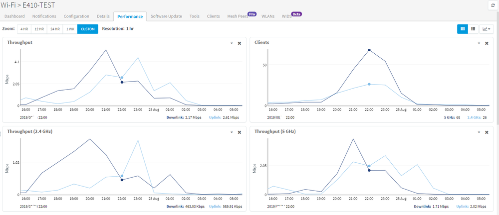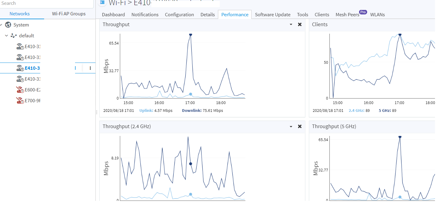 slv700 Posted August 19, 2020 Author Posted August 19, 2020 На базе стояли ранее UniFi AC. Как то работало, но основная проблема - не тянуло нагрузки, отсутствие роуминга ( можно стерпеть), нет реального outdoor и др. Юзеры имели обыкновение кучковаться в одном месте, по 400-500 человек на ограниченной площади, например на танцплощадке и прилегающем променаде и подключение к вайфай такого количества юзеров валило сеть. При этом точка доступа UniFi AC начинала ложиться при 40+ клиентах на ТД. Начали с иcпытаний 4-х E410, и по одной точке доступа E600 и E700. Вот данные работы под нагрузкой одной из точек доступа E410 - скрины сняты с облачного NMS - контроллера сети cnMaestro. В пике 186 клиентов , загрузка ТД Download 47+ Upload 17 Mbps. Speedest c одного из клиента DL 54 Mbps/UL 18 Mbps . Задержка 10 ms. CnMaestro ведет статистику загрузки всех точек доступа по количеству клиентов и трафику . Видим в 17.00 вечера вчера, видимо конец занятий, на точке доступа E410 89 клиентов в 2.4 ГГц и 89 в 5ГГц, всего 178. Скорость 5ГГц - Download 75 Mbps +Upload 5 Mbps, 2.4 ГГц -DL 10М+ UL 1 Mbps = всего 91 Mbps. В DL 85Mbps - почти полностью утилизирован внешний 100М канал в Интернет.