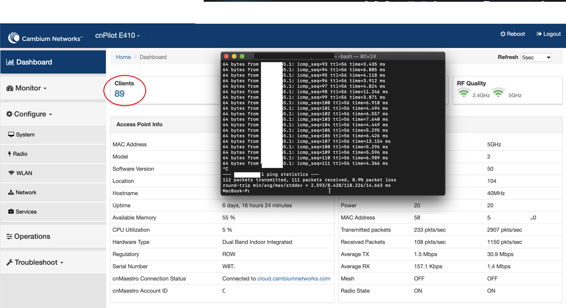 slv700 Posted September 9, 2019 Author Posted September 9, 2019 Вот скрин работы точки доступа E410 (802.11 ac wave2). Нагрузка 89 клиентов.