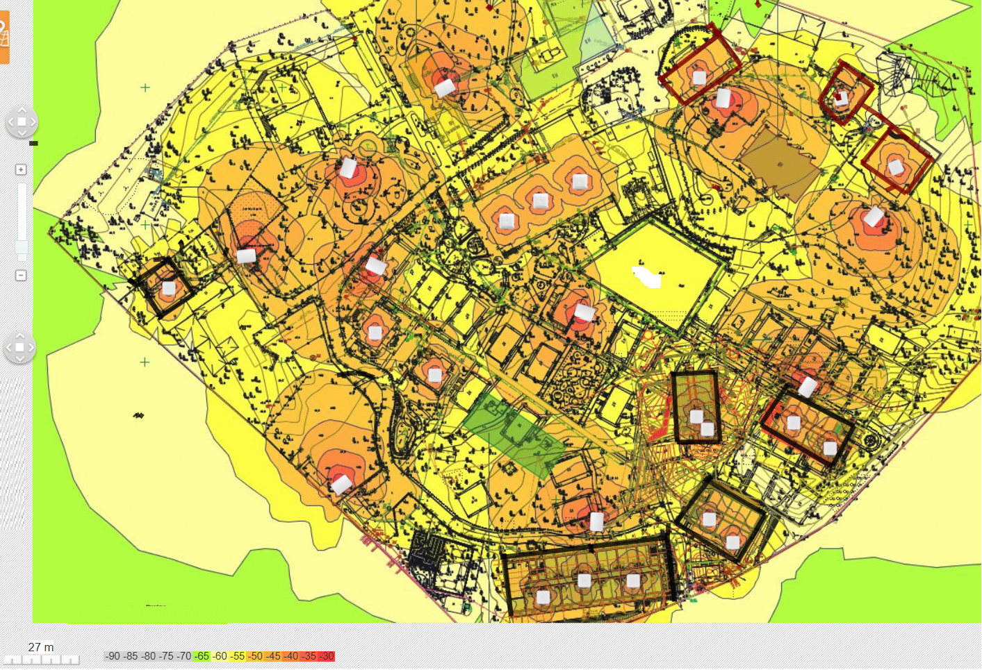 slv700 Posted August 19, 2020 Author Posted August 19, 2020 База отдыха в лесу, люди проводят конференции и отдыхают. Всего отдыхающих до 600 человек в заезде. Контингент - люди деловые и всем нужен вайфай доступ в Интернет. Внешний канал в Интернет -100 Mbps ( маловато, но пока так). Задача покрыть сервисом вайфай доступа всю территорию базы, 4 здания гостиницы и все домики. Все юзеры должны быть в роуминге по всей территории базы. План покрытия, расcчитан программой Cambium WI-FI Designer. Применены точки доступа indoor E410, E600, outdoor E700, E510.