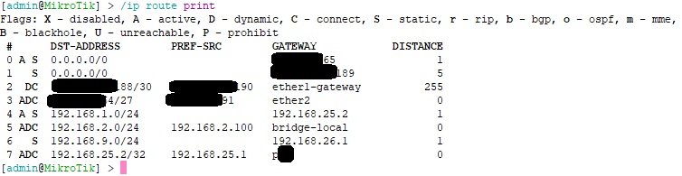 ShyLion Posted September 10, 2019 Posted September 10, 2019 192.168.2.1 - это что за зверь? вынь? тик? линух? циска? _подставить свое_ /ip route print where dst-address="192.168.2.0/24" Вставить ник Quote