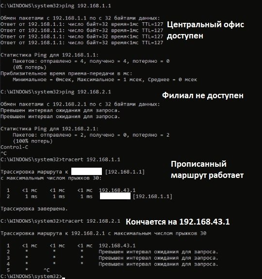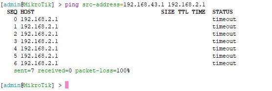 EvilH0mer Posted September 10, 2019 Author Posted September 10, 2019 4 минуты назад, ShyLion сказал: ping src-address=192.168.43.1 192.168.2.1 Если правильно понял то так. И на всякий случай, трассировка с ПК в офисе с подсети 192.168.1.0 Вставить ник Quote