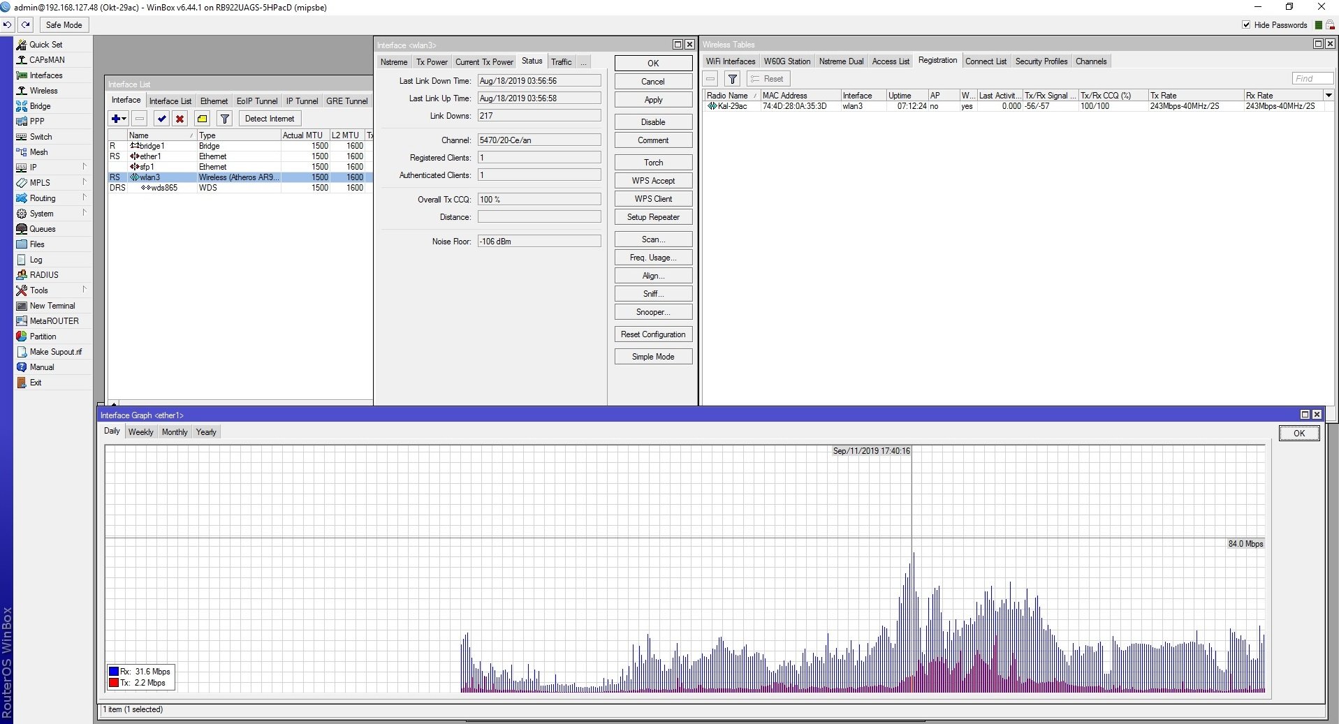 devd1 Posted September 11, 2019 Есть 2 радиолинка на 8км: 1. RB912UAG-5HPnD+jirous 24dBm / 5470MHz /режим N/ MCS13/nv2/ 216Mbps-40MHz/2S uptime 51days, ccq всё время скачет 88...100 2. RB922UAGS-5HPacD+jirous JRC-29 DuplEX / 5940MHz /режим N/ MCS14/nstreme/ 243Mbps-40MHz/2S (в АС работает хуже), uptime 12...36 hours, ccq 100 Очень вероятно, что зона Френеля частично закрыта лесным массивом посередине трассы. Высота подвеса 28м, березы в лесу - до 22м. Реальный трафик (интернет в деревню) по каждому линку - до 80мбит/с. 2 линка - т.к. не хватает пропускной способности, и для резервирования в ручном режиме. Сейчас один влан (район) ходит по одному линку, другой район деревни - по другому. Нужно увеличить скорость, обеспечить резервирование. 1. Вариант, без закупки оборудования. Мосты включены в D-link DGS3420-28SC, с другой стороны закуплен DGS-3000-10TC . Включить Link aggregation. Будет работать? И поднять антенны на пару метров с каждой стороны 2. Вариант. Что покупать из эконом-класса? # sep/11/2019 08:36:04 by RouterOS 6.44.1 # software id = VT92-GER6 # # model = 922UAGS-5HPacD # serial number = ************* /interface bridge add fast-forward=no name=bridge1 /interface wireless set [ find default-name=wlan1 ] band=5ghz-onlyn basic-rates-a/g="" \ channel-width=20/40mhz-XX disabled=no frequency=5470 frequency-mode=\ superchannel guard-interval=long ht-basic-mcs=mcs-14 ht-supported-mcs=\ mcs-14 installation=outdoor mode=bridge name=wlan3 nv2-cell-radius=10 \ nv2-preshared-key=******* nv2-security=enabled radio-name=****** \ rate-set=configured rx-chains=0,1 scan-list=5700-5900 ssid=**** \ supported-rates-a/g="" tx-chains=0,1 tx-power-mode=all-rates-fixed \ vht-supported-mcs=mcs0-7,mcs0-8 wds-default-bridge=bridge1 wds-mode=dynamic \ wireless-protocol=nstreme /interface wireless nstreme set wlan3 enable-nstreme=yes framer-policy=best-fit /interface wireless security-profiles set [ find default=yes ] authentication-types=wpa-psk,wpa2-psk eap-methods="" \ group-ciphers=tkip,aes-ccm mode=dynamic-keys supplicant-identity=MikroTik \ unicast-ciphers=tkip,aes-ccm wpa-pre-shared-key=********* \ wpa2-pre-shared-key=******* /ip ipsec proposal set [ find default=yes ] enc-algorithms=3des /queue type set 1 pfifo-limit=500 set 2 kind=pfifo pfifo-limit=500 /snmp community set [ find default=yes ] addresses=0.0.0.0/0 /system logging action set 1 disk-file-count=10 /interface bridge port add bridge=bridge1 hw=no interface=ether1 add bridge=bridge1 disabled=yes interface=*8 add bridge=bridge1 disabled=yes interface=*6 add bridge=bridge1 interface=wlan3 add bridge=bridge1 disabled=yes interface=*5 /ip address add address=192.168.127.48/24 interface=bridge1 network=192.168.127.0 /ip dhcp-client add dhcp-options=hostname,clientid interface=wlan3 /ip route add distance=1 gateway=192.168.127.10 /ip service set api disabled=yes /system clock set time-zone-autodetect=no /system clock manual set time-zone=+05:00 /system identity set name=******* /system logging set 0 action=disk set 1 action=disk set 2 action=disk add action=disk topics=critical /system ntp client set enabled=yes primary-ntp=192.168.127.11 secondary-ntp=192.168.127.5 /tool graphing interface add interface=ether1 -------------------------------------------------------------------------------------------------------------------------------------------------------------------------------------------------------------- # sep/11/2019 08:40:13 by RouterOS 6.43.8 # software id = 6HDG-VRUR # # model = 912UAG-5HPnD # serial number = ************* /interface bridge add fast-forward=no name=bridge11 /interface wireless set [ find default-name=wlan1 ] band=5ghz-onlyn basic-rates-a/g="" channel-width=20/40mhz-Ce disabled=no frequency=5940 frequency-mode=superchannel guard-interval=long ht-basic-mcs=mcs-13 ht-supported-mcs=mcs-13 installation=outdoor mode=bridge \ name=wlan3 nv2-cell-radius=10 nv2-preshared-key=********* nv2-security=enabled radio-name=**** rate-set=configured rx-chains=0,1 scan-list=5780-5840 ssid=vov supported-rates-a/g="" tx-chains=0,1 tx-power-mode=all-rates-fixed wds-default-bridge=\ bridge11 wds-mode=dynamic wireless-protocol=nv2 /interface ethernet set [ find default-name=ether1 ] mac-address=************* /interface wireless nstreme set wlan3 enable-nstreme=yes /interface vlan add disabled=yes interface=bridge11 name=vlan154_beeline vlan-id=154 add disabled=yes interface=bridge11 name=vlan212 vlan-id=212 add disabled=yes interface=bridge11 name=vlan218 vlan-id=218 add disabled=yes interface=bridge11 name=vlan219 vlan-id=219 add disabled=yes interface=bridge11 name=vlan612_beeline vlan-id=612 add disabled=yes interface=bridge11 name=vlan812_Beeline vlan-id=812 /interface wireless security-profiles set [ find default=yes ] authentication-types=wpa-psk,wpa2-psk eap-methods="" group-ciphers=tkip,aes-ccm mode=dynamic-keys supplicant-identity=MikroTik unicast-ciphers=tkip,aes-ccm wpa-pre-shared-key=******** wpa2-pre-shared-key=********** /ip ipsec proposal set [ find default=yes ] enc-algorithms=3des /queue type set 1 pfifo-limit=500 set 2 kind=pfifo pfifo-limit=500 /snmp community set [ find default=yes ] addresses=0.0.0.0/0 /system logging action set 1 disk-file-count=10 /interface bridge port add bridge=bridge11 hw=no interface=ether1 add bridge=bridge11 disabled=yes interface=vlan218 add bridge=bridge11 disabled=yes interface=vlan212 add bridge=bridge11 interface=wlan3 add bridge=bridge11 disabled=yes 