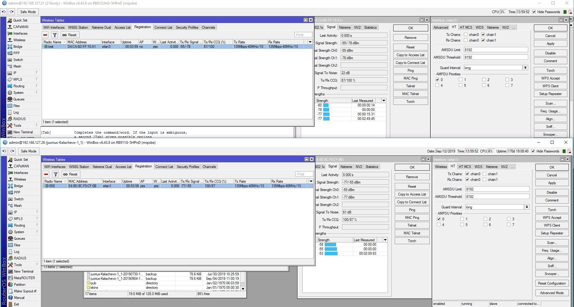 devd1 Posted September 12, 2019 тестирую 912-ю: уменьшение MSC вплоть до минимального значения не дает железобетонного ccq 100. на MSC=10 и меньше колеблется 99..100 Эксперимент с поляризацией выявил косячок: при выключении галок chain1 с обеих сторон, пакеты через линк не ходят, прием около -90. Если выключить на одной стороне чеин1, а на другой чеин0 (скриншот), то работает, ccq=100 только на MSC=1, тест качает 17 при канальной 27. На MSC=7 качает 44 при канальной 135. Если поменять местами, на станции чеин 0, на ответке чаин 1, то на MSC=7 при канальной 135 качает тестом 67мбит tcp, т.е. лучше чем в первом варианте. То, что перепутаны поляризации, ведь не страшно?Ну посылает один передатчик в чеин 0, волновод пропускает вертикальную поляризацию, ответный принимает этот сигнал в вертикальной поляризации, но в чеин1, я так понимаю. Или я не прав? спектроанализатор могу средствами МТ сделать. ща займусь Вставить ник Quote Ответить с цитированием Share this post Link to post Share on other sites More sharing options...