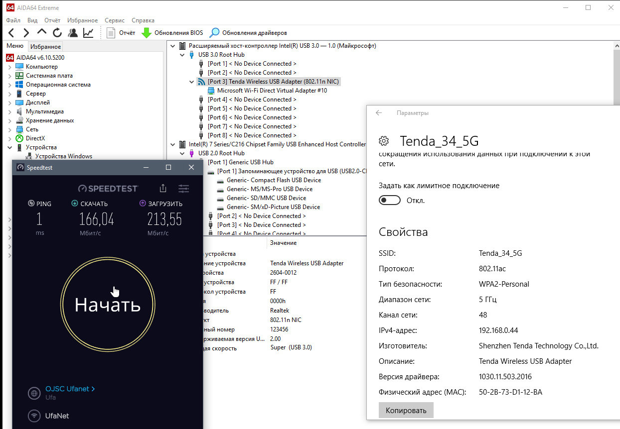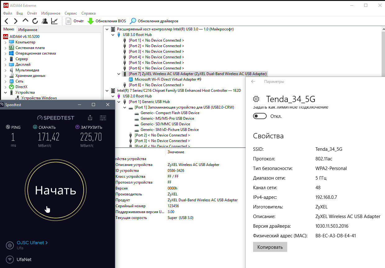 evgeny68 Posted December 22, 2019 Posted December 22, 2019 Уважаемые форумчане! Огромная просьба помочь советом и рекомендациями. Дело вот в чём. Пару месяцев назад решил перейти на более качественный скоростной интернет. Подключился по тарифу 500 мбит/с, поставил роутер Tenda AC15 (характеристики: 2.4Ггц-600мбит/с, 5Ггц-1300 мбит/с, LAN-1000 мбит/с мощность 20dBm). Выбирал его исходя из набора характеристик, отзывов о "нережущемся" wifi и стабильном качестве работы. Для соединения с компом использовал wifi адаптер Tenda U12 (USB3, скорость 1300 мбит/с, мощность 20dBm). Расстояние между компом и роутером 4 метра прямой видимости, на 5Ггц я один в эфире. Замеры speedtest по патчкорду на компе показали скорость вх. выше 700 мбит/с. Однако по wifi скорость вх. не поднималась выше 180 мбит/с. Адаптер подключён к usb3, настройками драйвера адаптер настроен на работу только по 802.11ас. Роутер настроен на ширину канала 80, протокол 802.11ас, максимальную мощность сигнала, были перебраны и оттестированы все каналы 5Ггц поочерёдно. Попробовал оттестировать с другим WIFI похожим по характеристикам адаптером Zyxel NWD6605 - скорость даже чуть меньше. Сделал скриншоты своих замеров, распечатал и отнёс всё в сервисный центр. От сервисного центра через неделю получил подтверждение на замену роутера, но повторно брать Тенду в сервисном центре не рекомендовали. Помониторив отзывы, поменял его на Asus RT-58U c аналогичными Тенде характеристиками (по 5Ггц, правда, скорость чуть меньше). Подключил. И точно такая же картина, как с Тендой. Скорость по wifi 5Гц вх. не выше 160 мбит/с. Опять танцы с бубном по настройке роутера, переустановка-сброс драйверов на адаптеры... При этом по патчкорду такой же отличный сигнал, как и в первом случае. Воспользовавшись правом замены в течении 2 недель, опять поменял роутер на более мощный Asus AC2400 (по характеристикам скорость на 5Ггц 1733 мбит/с). Та же самая картина!!! Люди пишут в отзывах, что эти роутеры хороши по скорости передачи по wifi, однако у меня плохая картина со всеми роутерами. Думал, может с компом проблема. Но для теста по патчкорду использую сетевую карту-USB, которую вставляю в тот же разъём usb3, что и адаптер. И скорость по патчкорду отличная. Знающие люди, подскажите пожалуйста, куда ещё копать? Вставить ник Quote