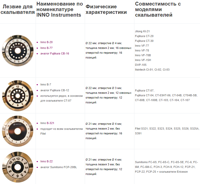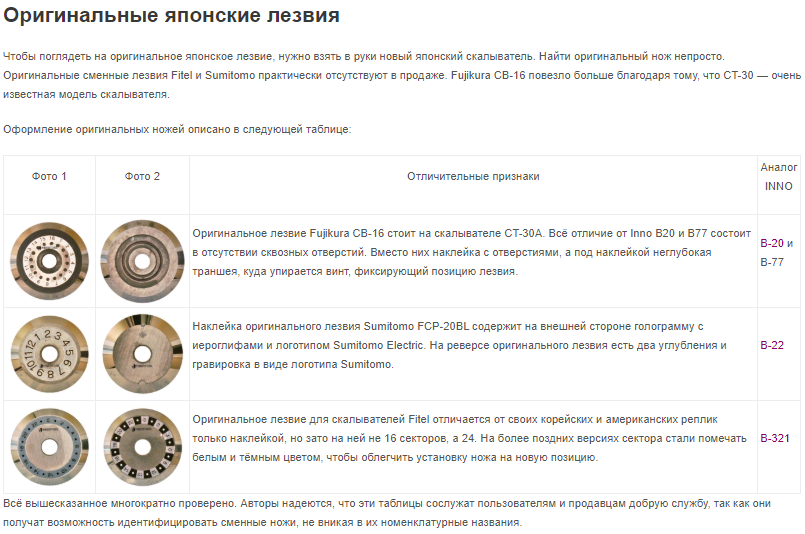 Bachaa Posted January 2, 2020 Author Posted January 2, 2020 59 минут назад, [anp/hsw] сказал: в том числе от угла заточки ножа - чем он меньше, чем глубже его можно опускать в волокно. Скалывателей не так уж и много. Ножей, вероятно, еще меньше. Вот тут ребята постарались и показали совместимость ножей inno instrument https://fibertool.ru/news/obzory_oborudovaniya/smennye-nozhi/ Скопирую сюда картинку 1 час назад, [anp/hsw] сказал: Если хочется конкретных цифр, то на стр.9 Интереснейший документ! Изучу, спасибо большое. В планах собрать стенд для настройки высоты ножа в скалывателях. Также хочу понять насколько изменяется положение ножа в скалывателях при вращении высотных регулировочных винтов. В продаже на али есть недорогие индикаторы стрелочного типа. У них чувствительность одного деления 10 микрон. (0,01 мм), что равно диаметру сердцевины волокна. С такой чувствительностью по идее можно очень точно настроить погружение ножа в волокно. Вставить ник Quote