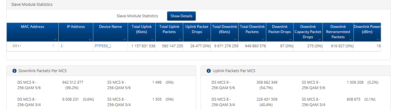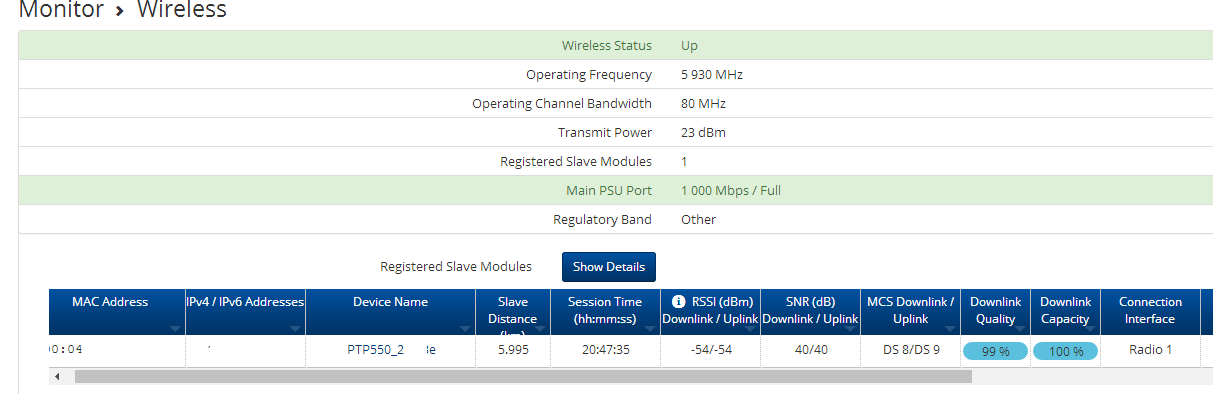 slv700 Posted January 31, 2020 Posted January 31, 2020 Антенны диш 30 дБи. Сигналы -54dBm. CA Master CA Slave Ключевая информация о соcтоянии линка на Cambium представлена в Monitor->Performance- рабочие модуляции, на которых передаются и принимаются пакеты данных, % потерь на MAС уровне радио и % ретрансмиттов пакетов ( повторов передачи потерянных или искаженных пакетов)
