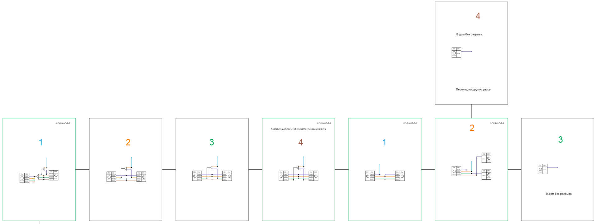 Bachaa Posted February 20, 2020 Author Posted February 20, 2020 На днях еще один сегмент сети занес на чертежи. На 8 муфт получилось равностороннее дерево на четырех волокнах каскадом через делитель 1х2 на первых четырех муфтах. А вот собственно схема. Если вдруг пролетит комета и все включатся, то такой схемы хватит включить все 100% домов. Но сейчас по дороге есть отвод 50% сигнала на другую улицу, на которой примерно такое же количество домов. Постепенно производим замену оборудования ELTEX на китайскую C-data, Переводим линии на Epon и стоимость включения снижается на 1500 рублей. Вставить ник Quote