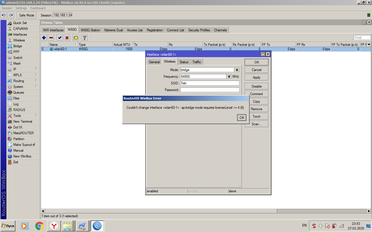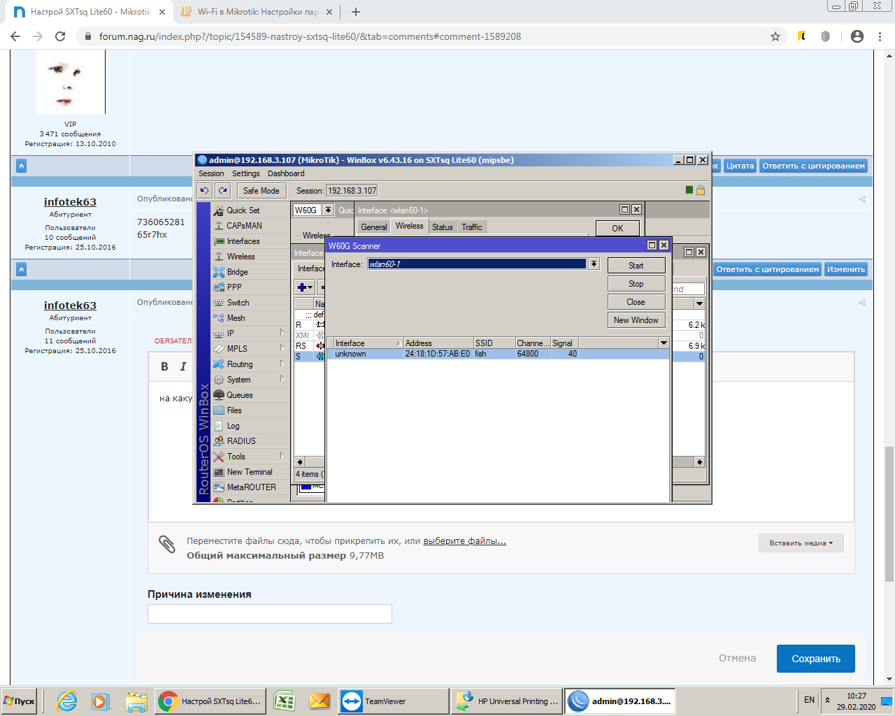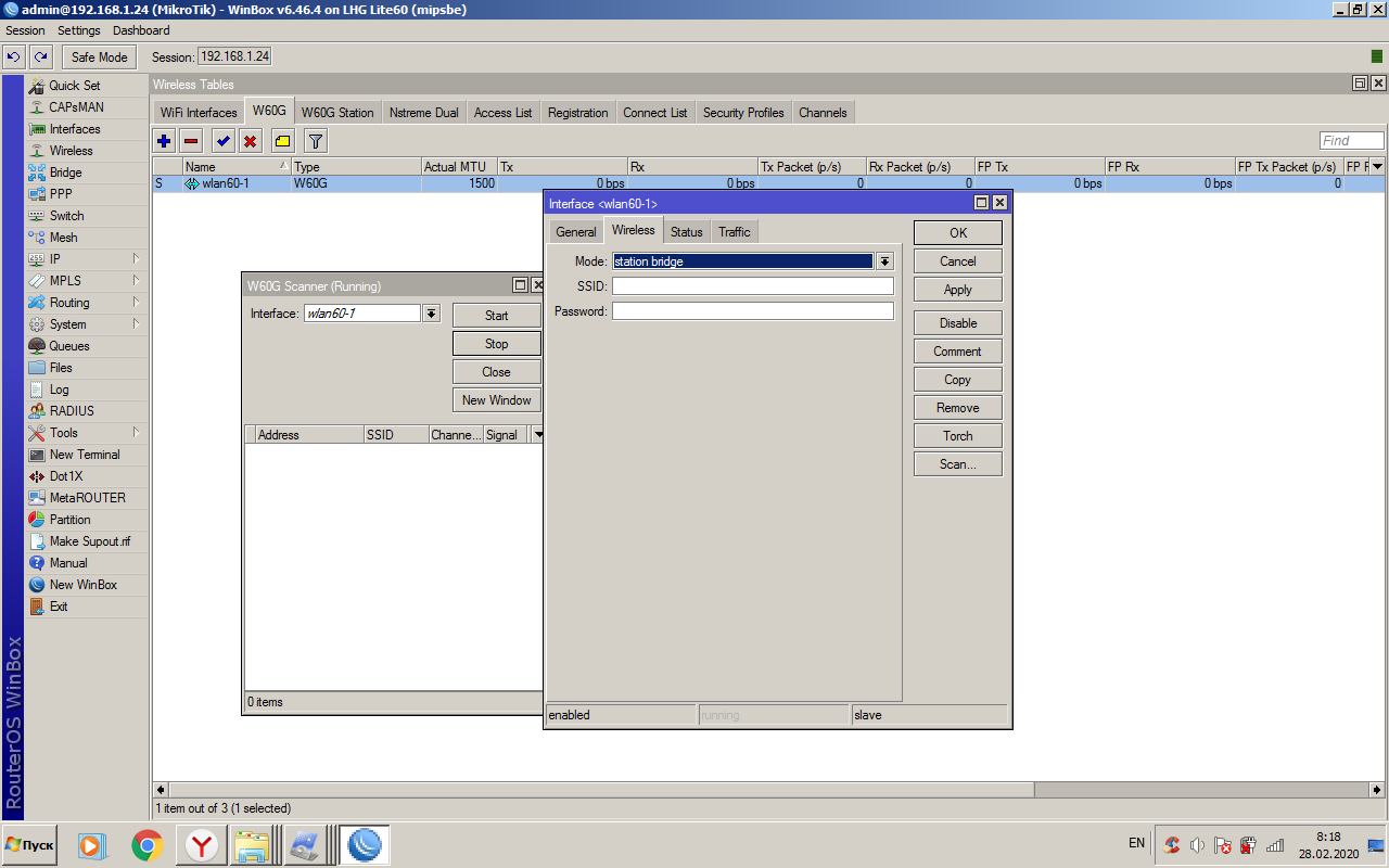 infotek63 Posted February 28, 2020 Author Posted February 28, 2020 (edited) а в каком разделе в station bridge сканируется сетка ? окно scan вылезает пустым? с одной стороны стоит MikroTik LHG 60G, а с другой SXTsqLite60, если это важно? Edited February 28, 2020 by infotek63 Вставить ник Quote