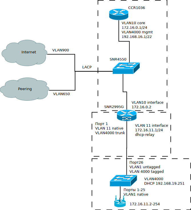 televid Posted March 23, 2020 Posted March 23, 2020 Задумался я тут о том, как бы перевести текущую сеть на технологию vlan per user. Сейчас сделан влан на коммутатор доступа, и оно как бы работает, но хочется лучше. Схема сети такая - микротик в качестве браса и маршрутизатора (на нём бгп с одним default route и одним пиринговым соединением, шейперы, файерволл, нат и dhcp-серверы для домовых вланов). Коммутатор ядра - SNR 4550, который сейчас занимается только несколькими вланами - ядро, аплинки и менеджмент. Коммутаторы агрегации - SNR2995. На агрегации домовые вланы сразу терминируются и дальше до микротика идёт уже L3 в влане ядра. Между агрегациями и микротиком поднят OSPF, чтобы не писать маршруты руками. Также на агрегациях подняты dhcp-релеи в домовых вланах. На доступе полный зоопарк от DES3526 и SNR2985 до пары DCN и Huawei. Абонентские порты все в первом влане, который на агрегации терминируется как порядковый. Что мне нравится - однотипная конфигурация доступа. Монтажники просто берут готовый подменный коммутатор с типовым конфигом и всё. Это важно, так как коммутаторы выходят из строя не то чтобы часто, но именно в неподходящий момент. Достаточно простая и прозрачная конфигурация всего остального. Практически чистый роутинг, загрузка микротика выше 20% не поднимается, даже с учётом немаленького списка блокировки БелГИЭ на файерволле и кучи PCQ-очередей. Отсутствие привязки абонента к порту/влану - сдох порт/перебили кабель - монтажники приехали, пересадили абонента на другой порт или вообще на соседний коммутатор без лишних телодвижений. Что мне не нравится - невозможность выдачи белых адресов и ipv6. Отсутствие привязки абонента в биллинге кроме как по мак-адресу (в биллинге нет информации об ip-адресе пользователя, dhcp-серверы на микротике просто обращаются к радиус-серверу биллинга), из-за чего пришлось писать скрипты для микротика, которые работают ооочень медленно. Ну и вообще некоторый бардак в организации сети - строилось всё абы как (на плинтах, например, не помечено какие это порты коммутатора), биллинг натягивался на уже работавшую сеть как сова на глобус. Чего хочется - в идеале чтобы со стороны биллинга и абонентов это выглядело как плоская сеть, на самом деле ею не являясь. Чтобы не пришлось вводить привязки адресов к домовым вланам. Избавиться от OSPF - работает без нареканий, но для ipv6 всё равно надо переходить на OSPFv3, так что почему бы его вообще не выкинуть. Возможность выдачи абонентам как белых, так и серых адресов, в дуалстеке. Желательно просто по нажатию кнопочки в личном кабинете (т.е. по умолчанию все абоненты за натом). Однотипной конфигурации доступа и агрегации (чтобы биллингу для выдачи белого адреса не надо было жонглировать вланами по всей цепочке). И хотелось бы сохранить связность внутри сети. Внутреннего трафика мало, но пусть будет. Собрал тестовый стенд, проверил пару идей и все мне как-то не очень понравились. Обычный vlan per user через qinq с подобием ip unnumbered потребует заведения на микротике примерно 7200 вланов, их интерфейсов и dhcp-релеев (300 домовых коммутаторов по 24 порта, но абонентов всего полторы тысячи). Не уверен, что такое будет работать устойчиво. Либо придётся городить скрипты, которые будут это как-то создавать динамически. Т.е. например, есть default vlan без доступа в остальную сеть, при выдаче в нём адреса абоненту срабатывает lease-скрипт, которые перекидывает это в