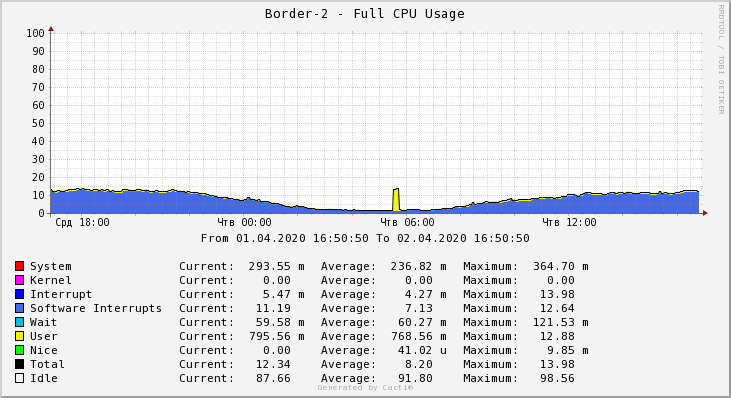 rdmitrich Posted April 2, 2020 Author Posted April 2, 2020 4 минуты назад, Saab95 сказал: Вам явно надо посмотреть правильность конфига, потому что у нас микротики 9-ти ядерные 2 гига натят / шейпят с подобной загрузкой, но никак не 800 мегабит. конфиг стандартный Carbon, используем PPPoE Вставить ник Quote