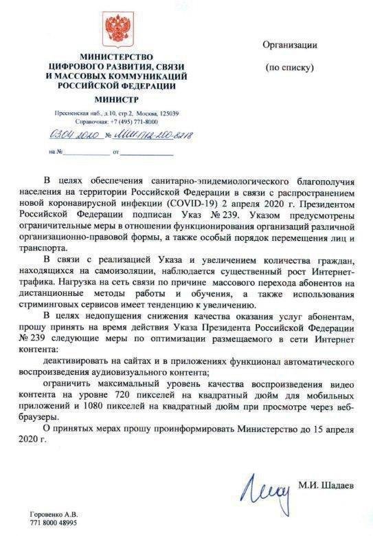 Связной (С) Posted April 4, 2020 Posted April 4, 2020 1 час назад, Andrei сказал: Фейк Нет. - Минкомсвязь разослала интернет-компаниям письмо с просьбой не допустить снижения качества оказания услуг на фоне роста трафика. Об этом "Российской газете" сообщили в пресс-службе ведомства. https://rg.ru/2020/04/03/minkomsviaz-prosit-snizit-kachestvo-video-dlia-umensheniia-nagruzki-na-seti.html Вставить ник Quote