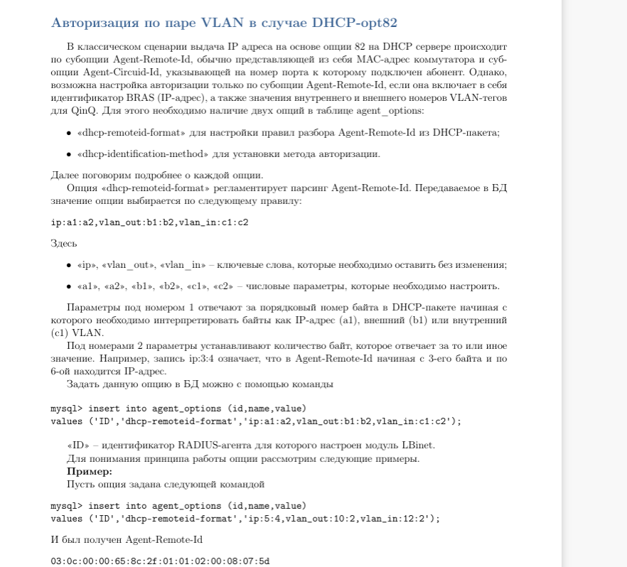 Saab95 Posted April 7, 2020 Posted April 7, 2020 Вам надо определиться сначала с оборудованием, которое участвует в работе. Если у вас это микротик + коммутатор, к которому подключены абоненты к своим портам, это одно. Если микротик релеет запросы на другое устройство, то зачем тут микротик тогда? На коммутаторе на каждый абонентский порт выделяете свой влан. Если коммутаторов у вас много, то можете каждый коммутатор загнать в свой дополнительный влан через QinQ. На микротике создаете вланы на нужных портах. QinQ на нем делается так - сначала создаете влан с номером QinQ, а уже на нем вланы внутри этого QinQ. Далее на каждый влан создаете DHCP сервер, и для него включаете авторизацию по радиусу. На биллинге заводите абонентов на основе имени влана, когда биллинг увидит запрос с нужным именем он отдаст нужный IP на этот влан, ну и соответственно абоненту. Просто тут такое дело, эта 82 опция уже устарела и предназначена была много лет назад для случаев, когда QinQ еще не придумали, что бы при минимальных затратах как то разделять абонентов в пределах коммутатора. В текущих реалиях кроме как влан на пользователя схем и не используют. Вставить ник Quote