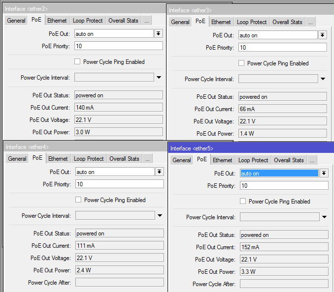 Saab95 Posted April 14, 2020 Posted April 14, 2020 1 минуту назад, alibek сказал: Это у каких моделей такой штатный БП? У тех MT, что у меня есть под рукой, в БП минимальный ток 0,5А. Устройства вида SXT и DISC, LHG, Omnitik и прочие мелкие идут с БП 24в 0.38а. QRT и аналогичные 24в 1а или 1.2а. NetBox 24в 0.8а. Кроме всего есть и простые БП от микротика, продающиеся отдельно 24в 1а и другие. Вот во вложении смотрите сами, где 66ма там к БС никто не подключен. Где 111ма там 1 клиент почти не качает ничего, 1-2м. Где 140ма там 1 клиент качает мегабит 40-50. Где 152ма там 8 клиентов суммарно качают 25-30. Везде мощность 18дбм. Оборудование подключено от RB750UP. Который сам питается через витуху по 1 порту от БП через инжектор внизу, метров 30 кабеля, от штатного БП на 2.5а. Пусть даже предположим что каждая антенна потребляет в пике 200ма, сам RB750UP еще 200, то как раз получается 1а потребления. И падение напряжения на 30 метрах кабеля 1.9в при токе примерно 0.6а. 13 минут назад, alibek сказал: А что, Микротик умеет изменять закон Ома? Падение напряжение зависит от протекающего тока, а он зависит от внутреннего сопротивления электроприемника. Но никак не от мощности источника питания. Ну так если вы сами про этот закон вспомнили, то должны знать, что если напряжение уменьшается, то ток должен увеличиваться, что бы устройство на дальней стороне могло получить необходимую ему мощность. Если блок питания слабый, например 0.2а, а устройство на дальней стороне потребляет те же 0.15а, то на длинном кабеле оно может начать сбоить, потому что при понижении напряжения, например до 20в, ток потребуется больше, и 0.2а внизу может просто не хватить, ну или со временем блок питания сгорит. Вставить ник Quote