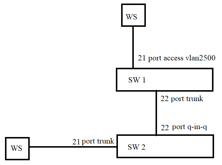 PROBLEMA Posted April 15, 2020 Author Posted April 15, 2020 (edited) vlan 1;2500; ! Interface Ethernet1/0/21 switchport access vlan 2500 ! Interface Ethernet1/0/22 switchport mode trunk -------------------------------------------Настройки портов на первом свиче vlan 1277;2450-2849;3255 ! Interface Ethernet1/0/21 switchport mode trunk ! Interface Ethernet1/0/22 dot1q-tunnel selective s-vlan 3255 c-vlan 2450-2849 dot1q-tunnel selective enable switchport mode hybrid switchport hybrid allowed vlan 1008;1100;1184-1191;1193;1277 tag switchport hybrid allowed vlan 3255 untag -------------------------------------------Настройки второго свича Edited April 15, 2020 by PROBLEMA Вставить ник Quote