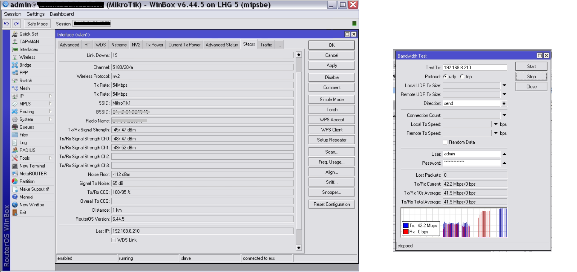 lomal Posted April 22, 2020 Author Posted April 22, 2020 Пока что вернул на оба устройства IP-адреса, чтобы воспользоваться встроенным тестом скорости. Send и Receive по отдельности получаются примерно по 25 МБит/с. Всё вместе (Both) получается около 40 МБит/с. Попробовал понижать TX power: с 17 постепенно снизил до 8 на обоих микротиках, при этом результаты замеров скорости не изменились. Quote Вы хотя бы скрин вкладки статуса сигналов со стороны клиентского устройства привели, что бы посмотреть что там не так. Прикладываю скриншот со стороны клиентского устройства. Quote Да там уровень сигнала под -30. Понизьте мощность до уровня сигнала -60 дБ Меньше 8 dBm? Вставить ник Quote