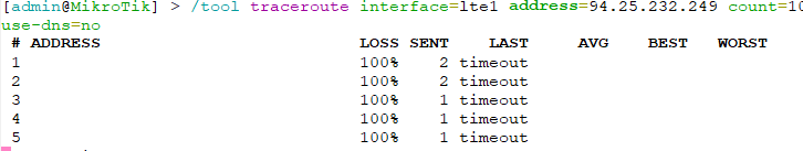 KFM Posted May 18, 2020 Author Posted May 18, 2020 (edited) 14 минут назад, minks сказал: Прогони вот это: /tool traceroute interface=lte1 address=94.25.232.249 count=10 use-dns=no /tool traceroute interface=lte1 address=77.88.8.8 count=10 use-dns=no /tool traceroute interface=lte1 address=8.8.8.8 count=10 use-dns=no /tool traceroute interface=lte1 address=1.1.1.1 count=10 use-dns=no остальные также Edited May 18, 2020 by KFM Вставить ник Quote