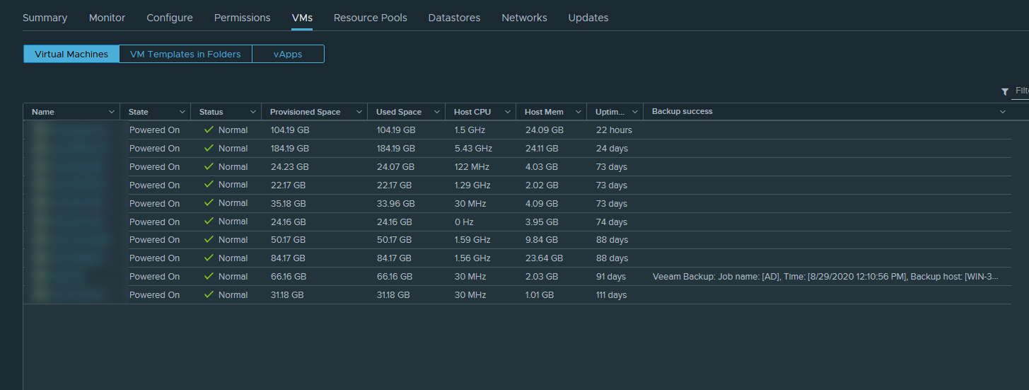 starik-i-more Posted August 15, 2020 Posted August 15, 2020 В 06.08.2020 в 12:57, jffulcrum сказал: Но я не помню, есть ли возможность в vCenter отфильтровать список ВМ по атрибутам или надо в свойства каждой проваливаться, чтобы атрибуты увидеть. Можно фильтрануть список ВМ по аттрибутам через PowerCLI Вставить ник Quote