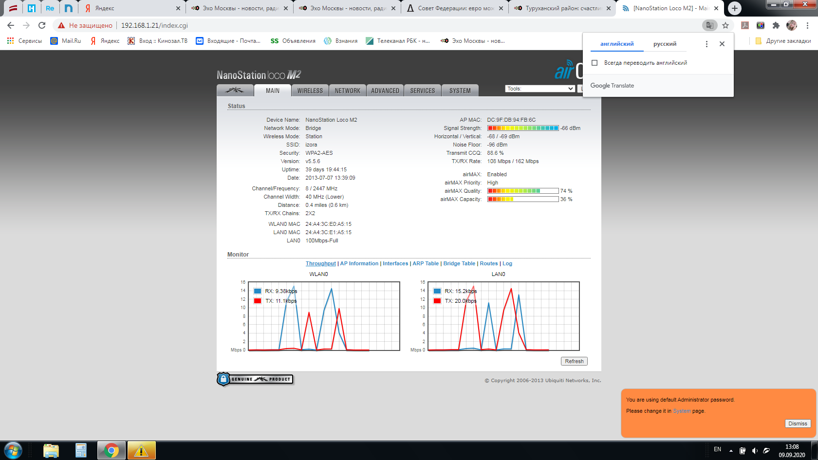 Saab95 Posted September 17, 2020 Posted September 17, 2020 В 11.09.2020 в 10:28, izora сказал: На базе с обратной стороны металлический профнастил балкона. Перенесите ее на кирпичную стену, подальше от металлических предметов. Как вариант, если балкон остеклен - попробуйте установить антенну внутри его (применив присоску или черенок от лопаты, или крепление на стену) предварительно выбрав лучшее место для антенны. При установки внутри антенна БС на прием будет получать меньше помех - т.к. остекление внесет некоторые затухания. Уменьшение уровня сигнала можно поднять увеличением мощности. В 11.09.2020 в 10:28, izora сказал: У меня на доме - кирпичная стена. На кирпичной стене дома это правильное место для установки. Вот размещать на мачте, если с более низкой точки видно - было бы не правильно. В 11.09.2020 в 17:40, rhianon_88 сказал: airmax отключили? Ну да, это может порой сильно влиять на скорость. В настройках Wireless есть пункт max data rate - попробуйте там снижать максимальные скорости, или поставьте для теста MCS7, это одноканальный режим. Делать надо сначала на клиенте, потом на базе. Вставить ник Quote