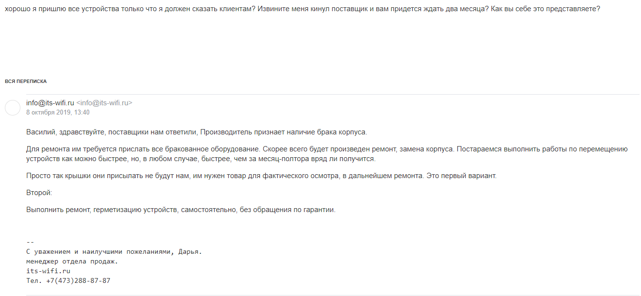 vasily Posted September 27, 2020 Posted September 27, 2020 вот нашел еще пару фото Вот переписку нашел с другим поставщиком. Они работают с WMD в добавок вам ссылочку там очеь много интересного пишут https://www.dns-shop.ru/product/841d593199e63330/tocka-dostupa-mikrotik-disc-lite5/opinion/ Вставить ник Quote